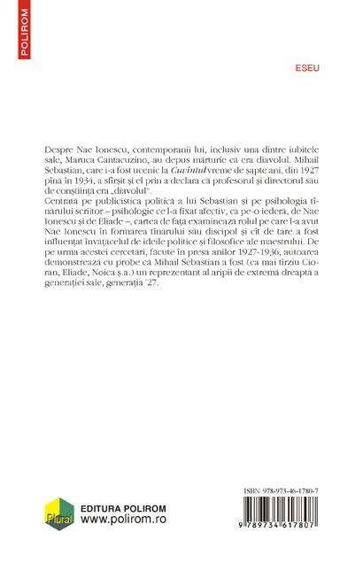 Centrata pe publicistica politica a lui Sebastian si pe psihologia tinarului scriitor – psihologie ce l-a fixat afectiv, ca pe-o iedera, de Nae Ionescu si de Eliade –, cartea de fata examineaza rolul pe care l-a avut Nae Ionescu in formarea tinarului sau discipol si cit de tare a fost influentat invatacelul de ideile politice si filosofice ale maestrului. De pe urma acestei cercetari, facute in presa anilor 1927-1936, autoarea demonstreaza ca Mihail Sebastian a fost (ca mai tirziu Cioran, Eliade, Noica s.a.) un reprezentant al aripii de extrema dreapta a generatiei sale, generatia ’27.