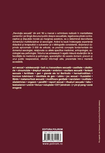 „Revolutia sexuala” din anii ’60 a marcat o schimbare radicala in mentalitatea oamenilor: pe linga discursul public despre sexualitate, legalizarea pilulei contraceptive si disputele morale pe marginea acestora, ea a determinat dezvoltarea domeniului multidisciplinar al sexologiei. Avind la baza indelungata experienta didactica si terapeutica a autoarelor si o bibliografie consistenta, dictionarul cuprinde peste 2 000 de articole, ce prezinta concepte fundamentale din domeniul sexologiei, relationate cu altele specifice medicinei, antropologiei, sociologiei sau psihologiei. Volumul se adreseaza in egala masura studentilor de la facultatile de medicina si psihologie, specialistilor din aceste domenii, precum si unui public nespecializat, oferind informatii utile, prezentate intr-o maniera accesibila.