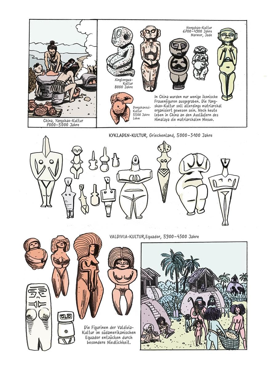 Stolze Hüften aus Knochen, Stein, gebranntem Ton. Wir nennen sie Göttinnen, doch wer oder was waren sie wirklich? In Büchern über die Steinzeit sehen wir vorrangig Männer beim Jagen, Feuerstein schlagen oder Höhlen bemalen. Die meisten Menschenbilder aber, die uns von Eiszeitmenschen selbst hinterlassen wurden, zeigen Frauen. Was waren das für Gesellschaften, die sie und ihr Geschlecht so zentral und ohne Scham darstellten? Nach Jahren der Recherche kehrt Ulli Lust zurück mit ihrem groß angelegten Sachcomic über die Anfänge der Kunst und die Bedeutung der Empathie für das Überleben unserer Spezies: Rund um die archaisch-weiblichen Figurinen entfaltet sich eine vergessene Welt, in der die Heldenreise Gruppensache war, die nur gemeinsam bestanden werden konnte, von Frauen, Männern, Kindern oder auch nichtbinären Menschen in mitunter reich geschmückter Rolle.
