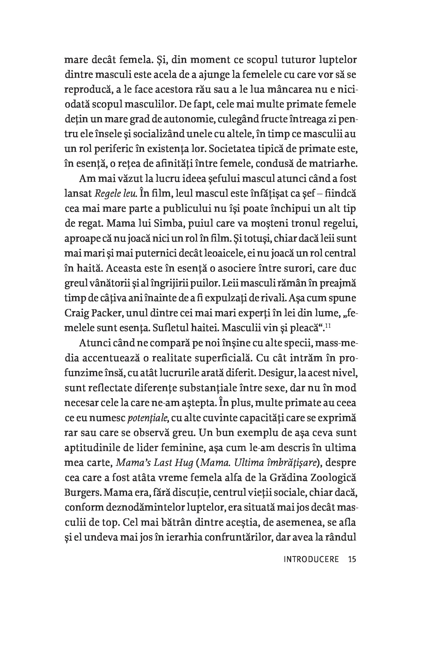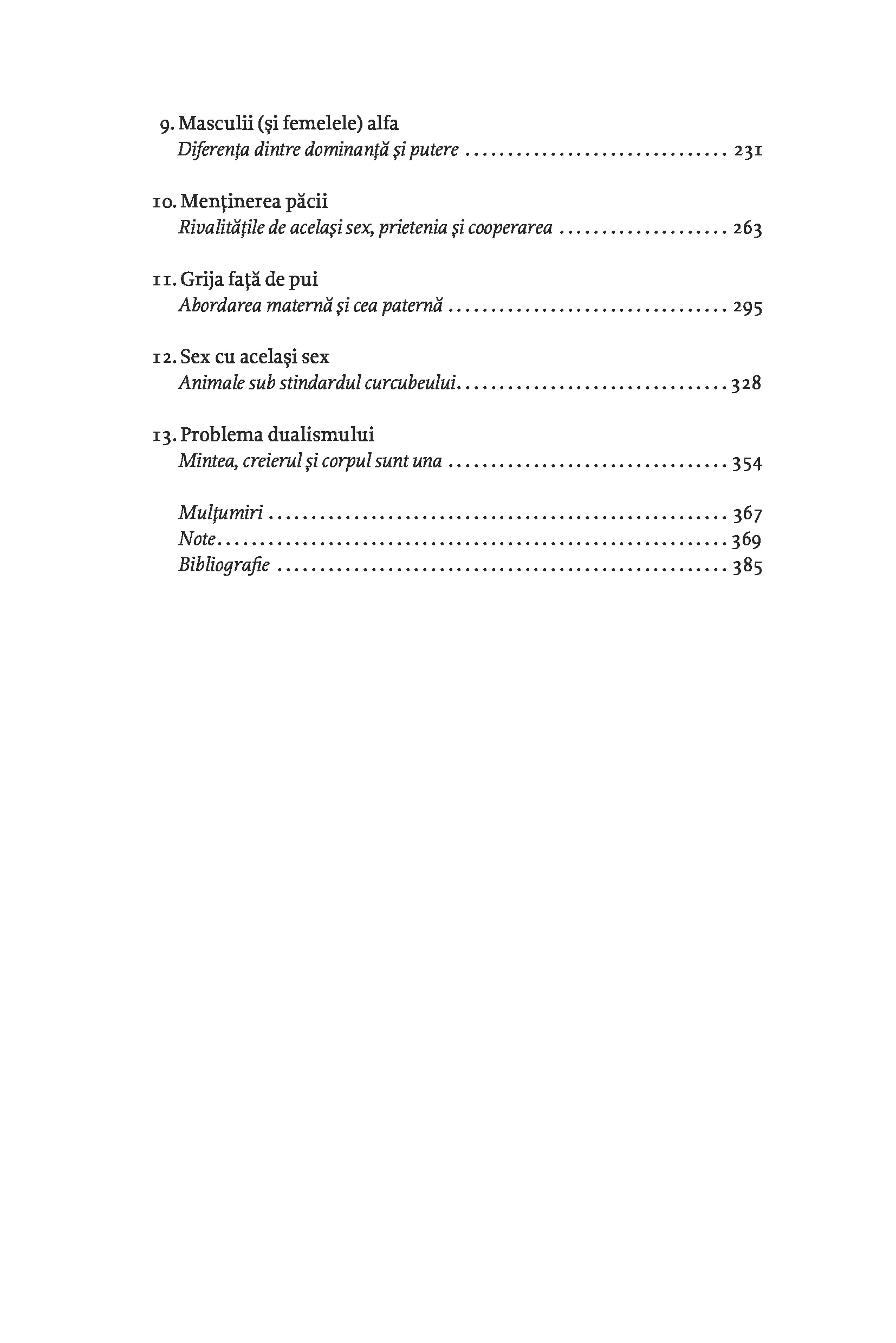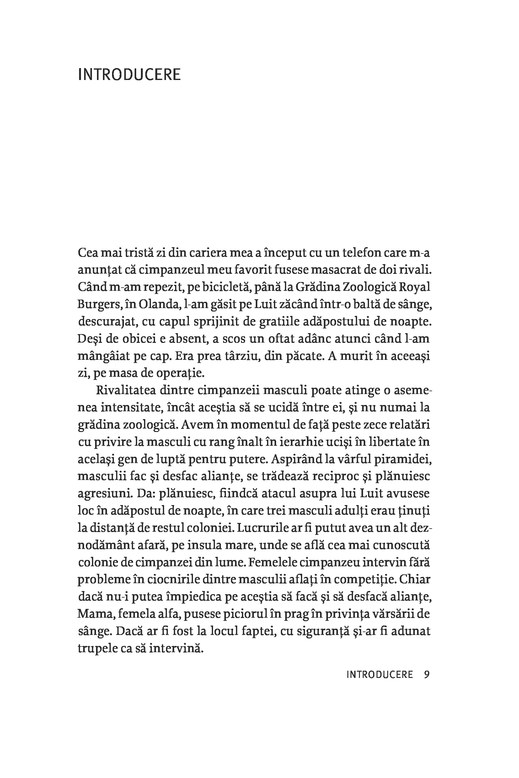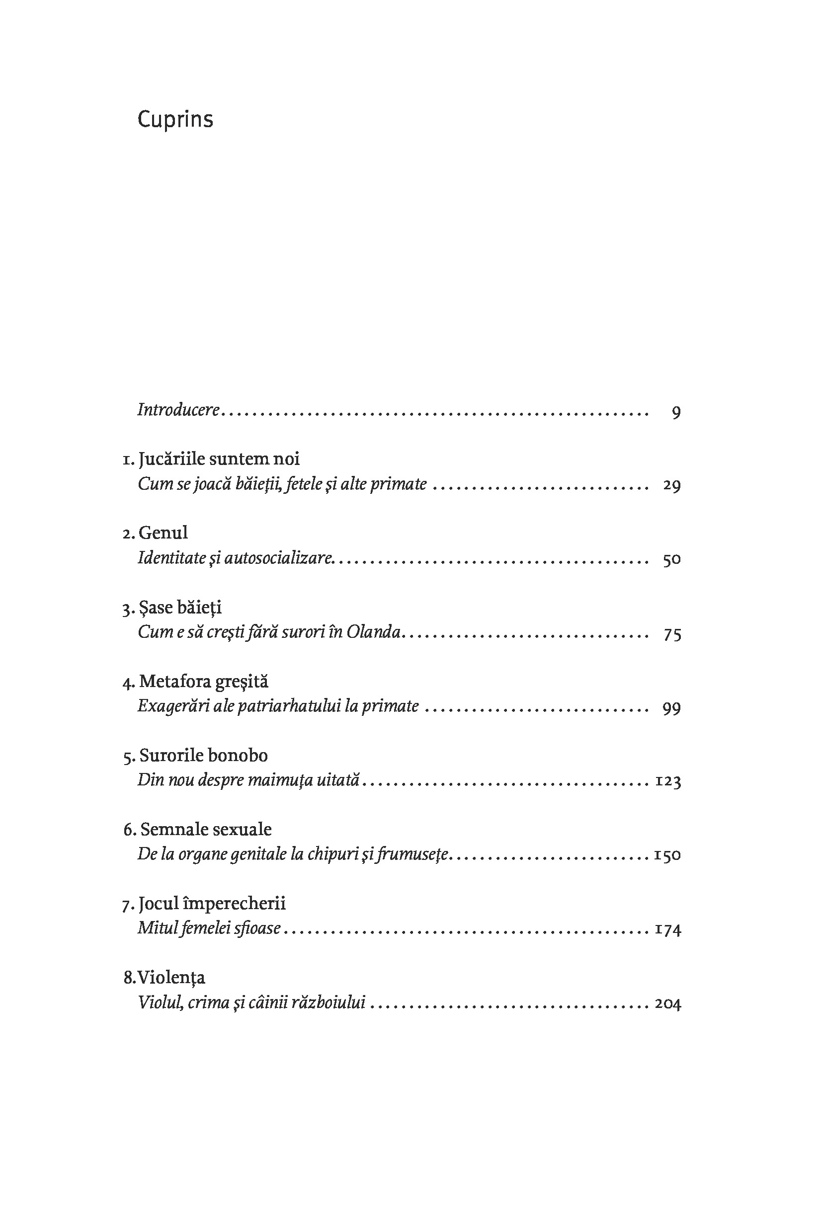 Pe baza observațiilor științifice și a experiențelor personale, primatologul olandez navighează pe terenul complex al relațiilor dintre indivizi, abordând subiecte precum identitatea personală sau socializarea și punând în discuție teoriile științifice depășite și concepțiile greșite despre dominare, putere și jocul împerecherii.