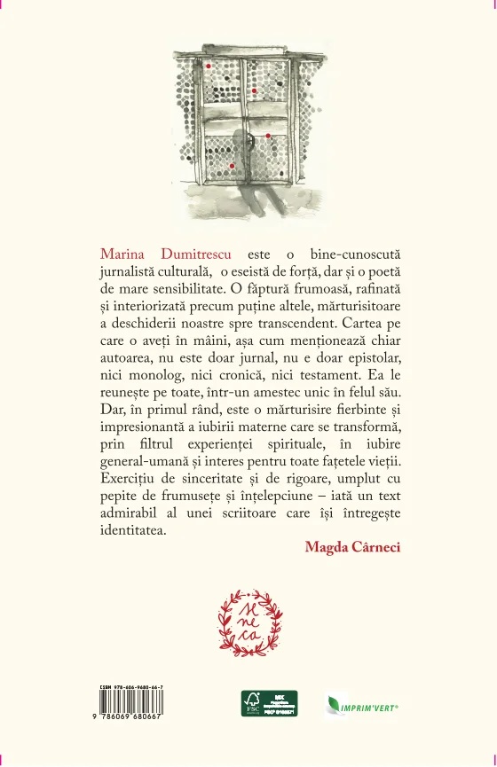 "Cartea aceasta nu e un jurnal, nu e un epistolar, nu e un testament, nu e o confesiune, nu e o cronică, nu e un monolog. Este câte ceva din toate, într-un ecou premeditat. Și jurnal și epistolar și testament și confesiune și cronică și monolog. Un pod de dor către voi, peste timp. Spre a vă încredința că nu există sfârșit. ”Marina Dumitrescu este o bine-cunoscută jurnalistă culturală, o eseistă de forță, dar și o poetă de mare sensibilitate. (...)