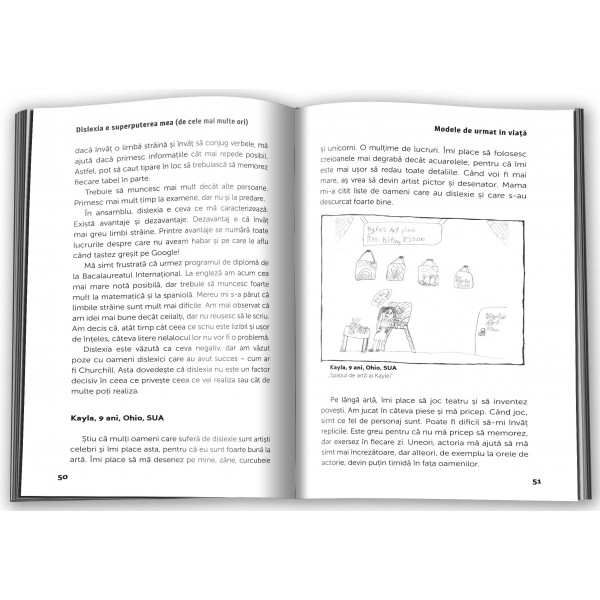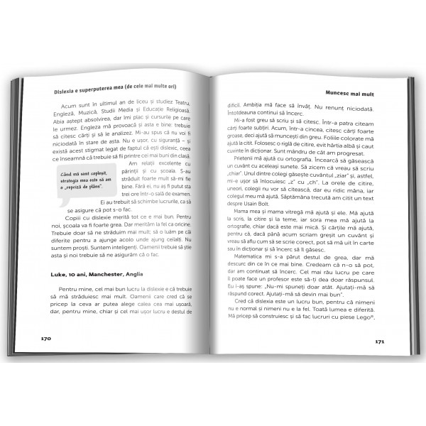 Această carte este unică: este prima carte despre copiii și adolescenții dislexici scrisă chiar de ei. În cele peste 100 de interviuri, tinerii între 8 și 18 ani arată cum s-au folosit de beneficiile creative ale dislexiei, găsind căi să se dezvolte atât la școală, cât și în afara ei. Cartea include sfaturi esențiale pentru profesori, despre cum ar trebui abordată dislexia la ore, și ilustrații semnate chiar de copiii intervievați. Această colecție inspirațională conține indicii prețioase și pline de înțelepciune despre cum să‑ți crești încrederea în tine și stima de sine – oferite chiar de cei care știu cel mai bine despre ce vorbesc.