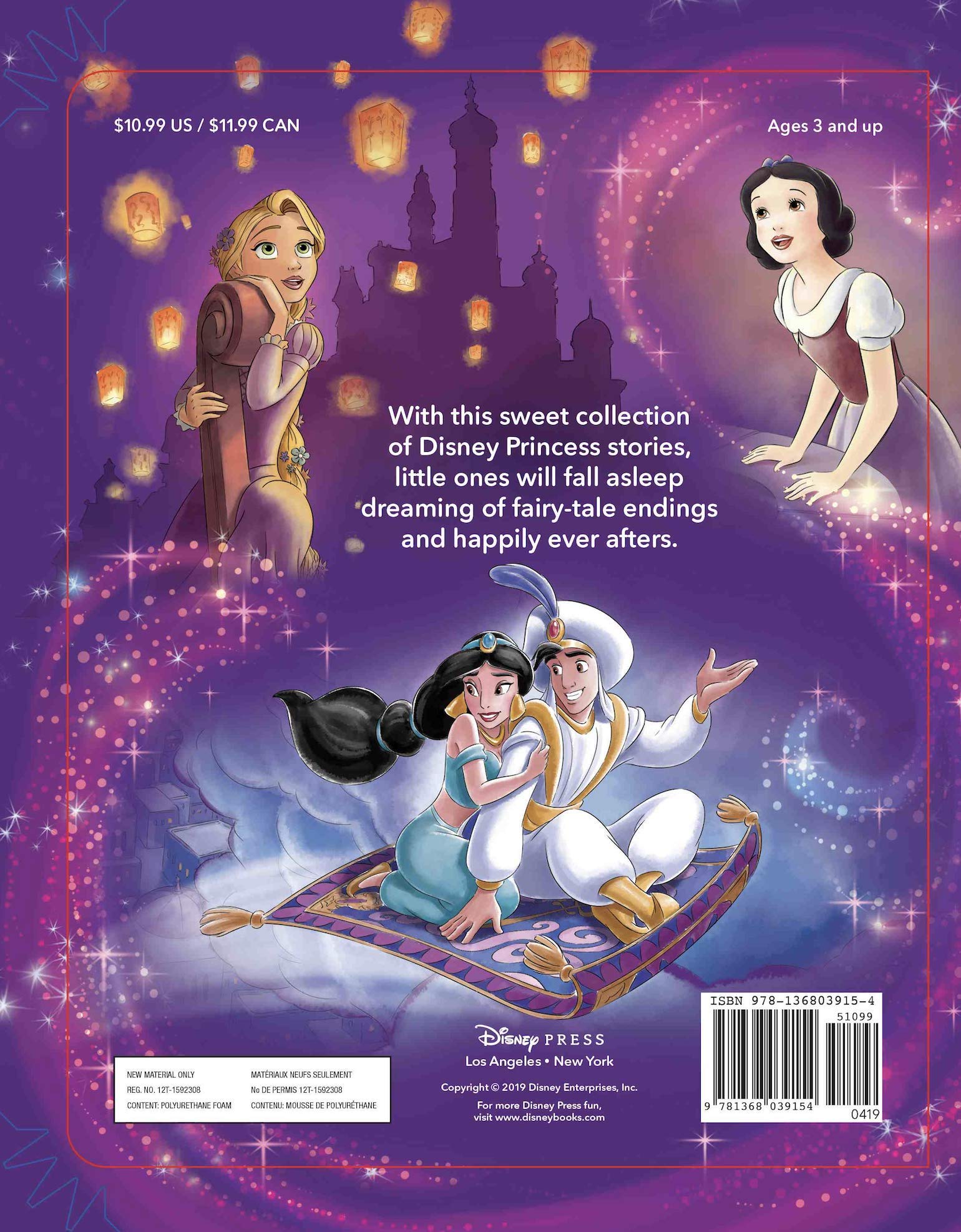 Join favorite Disney Princesses Cinderella, Ariel, Belle, Rapunzel, Snow White, and Jasmine, featuring six bedtime stories in one very special storybook. Graced with gorgeous classic illustrations on every page, stained edges, and a soft padded cover, this treasury is certain to become your little one's favorite bedtime treat.