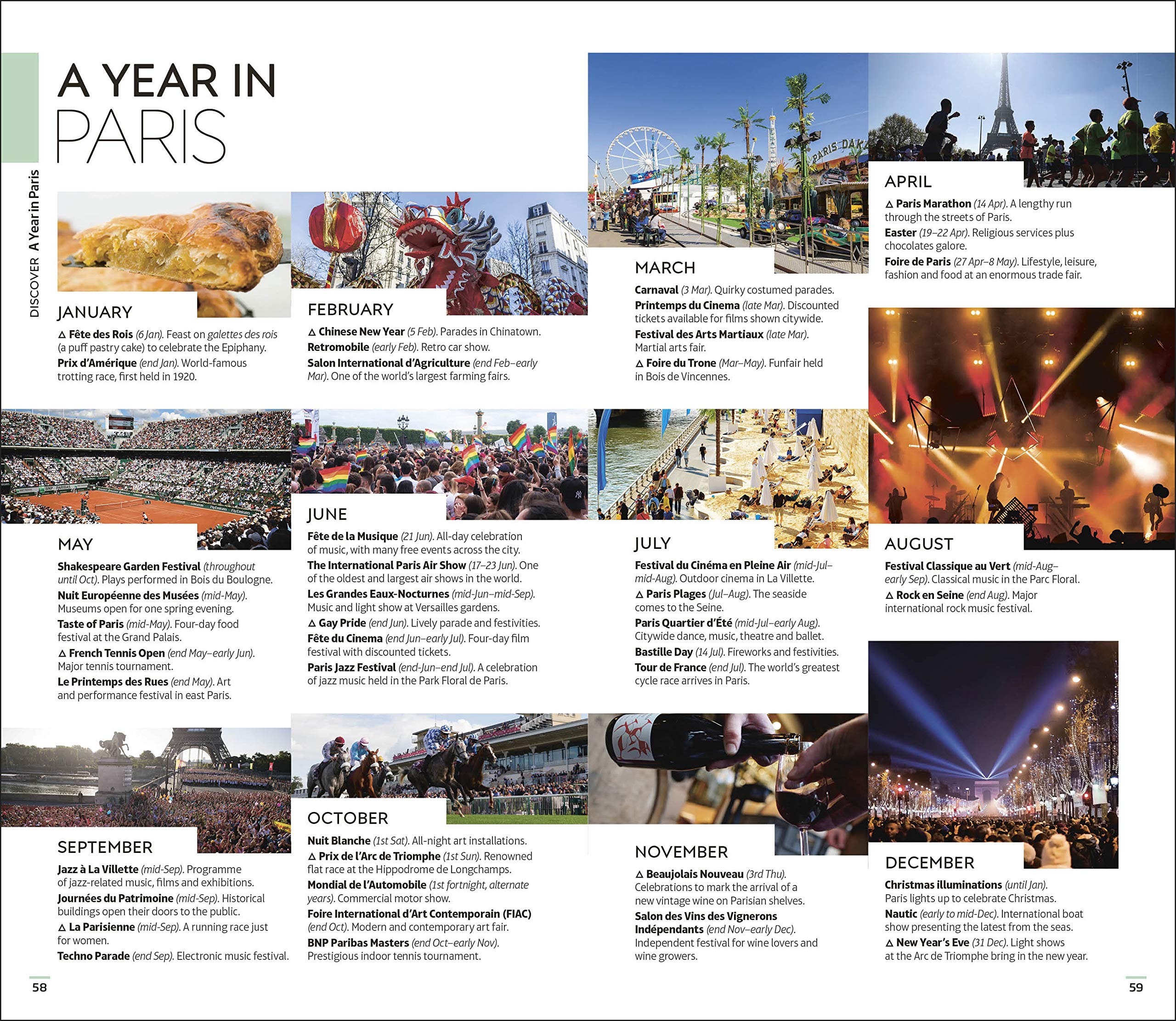 - A year-long calendar of events in Paris gives a selection of local events and festivals for all seasons