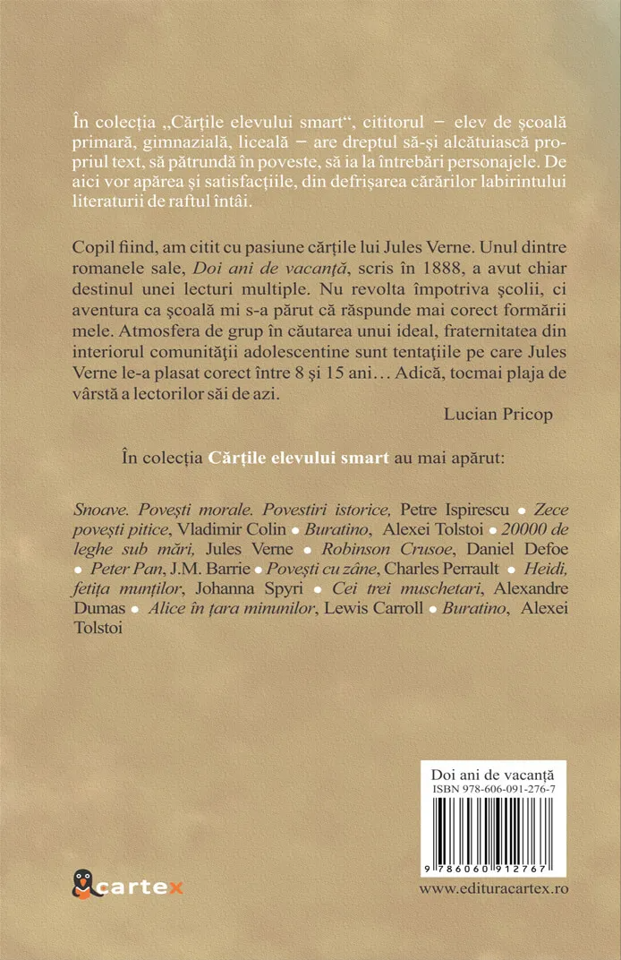Copil fiind, am citit cu pasiune cartile lui Jules Verne. Unul dintre romanele sale, Doi ani de vacanta, scris in 1888, a avut chiar destinul unei lecturi multiple. Nu revolta impotriva scolii, ci aventura ca scoala mi s-a parut ca raspunde mai corect formarii mele. Atmosfera de grup in cautarea unui ideal, fraternitatea din interiorul comunitatii adolescentine sunt tentatiile pe care Jules Verne le-a plasat corect intre 8 si 15 ani… Adica, tocmai plaja de varsta a lectorilor sai de azi.