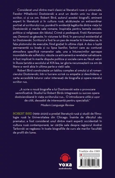 Robert Bird construiește un tablou complex al omului și al romancierului Dostoievski, într-o lucrare scrisă cu empatie și deschidere, o carte accesibilă tuturor celor interesați de biografia și opera marelui scriitor rus.