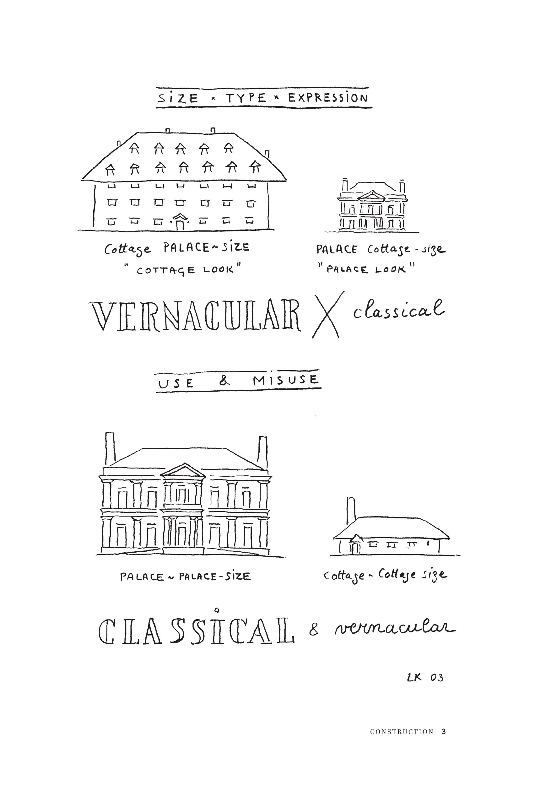 Architect Léon Krier's doodles, drawings, and ideograms make arguments in images, without the circumlocutions of prose. Drawn with wit and grace, these clever sketches do not try to please or flatter the architectural establishment. Rather, they make an impassioned argument against what Krier sees as the unquestioned doctrines and unacknowledged absurdities of contemporary architecture. Thus he shows us a building bearing a suspicious resemblance to Norman Foster's famous London “gherkin” as an example of “priapus hubris” (threatened by detumescence and “priapus nemesis”); he charts “Random Uniformity” (“fake simplicity”) and “Uniform Randomness” (“fake complexity”); he draws bloated “bulimic” and disproportionately scrawny “anorexic” columns flanking a graceful “classical” one; and he compares “private virtue” (modernist architects' homes and offices) to “public vice” (modernist architects' “creations”). Krier wants these witty images to be tools for re-founding traditional urbanism and architecture. He argues for mixed-use cities, of “architectural speech” rather than “architectural stutter,” and pointedly plots the man-vehicle-landneed ratio of “sub-urban man” versus that of a city dweller. In an age of energy crisis, he writes (and his drawings show), we “build in the wrong places, in the wrong patterns, materials, densities, and heights, and for the wrong number of dwellers”; a return to traditional architectures and building and settlement techniques can be the means of ecological reconstruction. Each of Krier's provocative and entertaining images is worth more than a thousand words of theoretical abstraction.