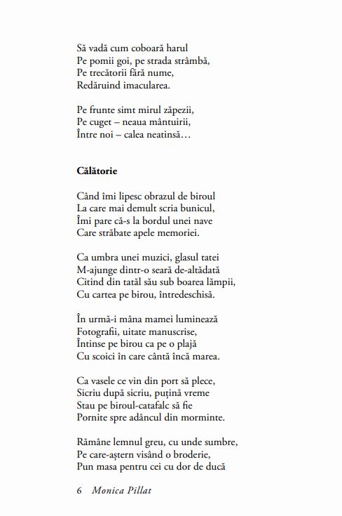 De la scrisul ca aventură a cunoașterii de sine, din volumul de debut Corăbii (1970), la descoperirea pluralității fascinante a eului și a vocilor cu care acesta intră în rezonanță, din Imaginaţia ecoului (1981) și Pluralul ca o veghe (1989), Monica Pillat a evoluat către un gen de poezie ce transcende palpabilul, pentru a explora misterele inefabilului în Dorul de rai (2005).