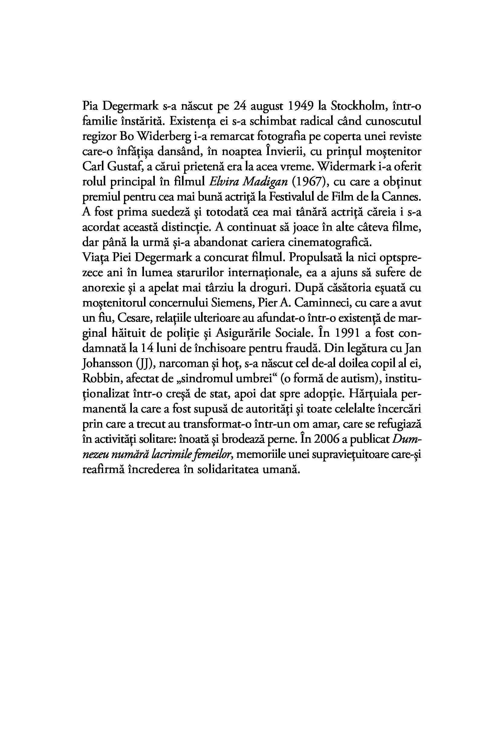 Suedeza Pia Degermark a interpretat rolul principal în filmul Elvira Madigan (1967), regizat de Bo Widerberg, cu care a obținut premiul pentru cea mai bună actriță la Festivalul de Film de la Cannes. Dumnezeu numără lacrimile femeilor, al cărei titlu se inspiră dintr-o veche credință, este cartea sa autobiografică.