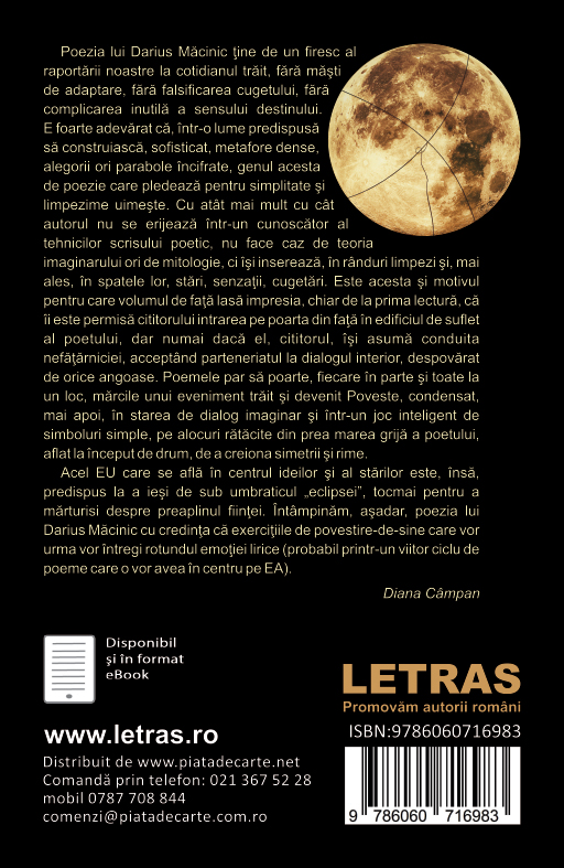 Acel EU care se afla in centrul ideilor si al starilor este, insa, predispus la a iesi de sub umbraticul ,,eclipsei”, tocmai pentru a marturisi despre preaplinul fiintei. Intampinam, asadar, poezia lui Darius Macinic cu credinta ca exercitiile de povestire-de-sine care vor urma vor intregi rotundul emotiei lirice (probabil printr-un viitor ciclu de poeme care o vor avea in centru pe EA). –DIANA CAMPAN