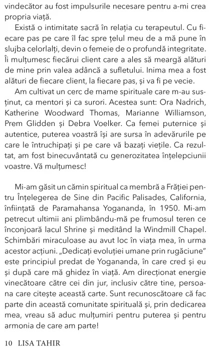 ,,Lisa Tahir ne-a expus o noua si extrem de eficienta cale catre vindecarea ranilor principale. Metodele sale sunt geniale. O bijuterie de carte." - Katherine Woodward Thomas, autoarea celor mai bine vandute