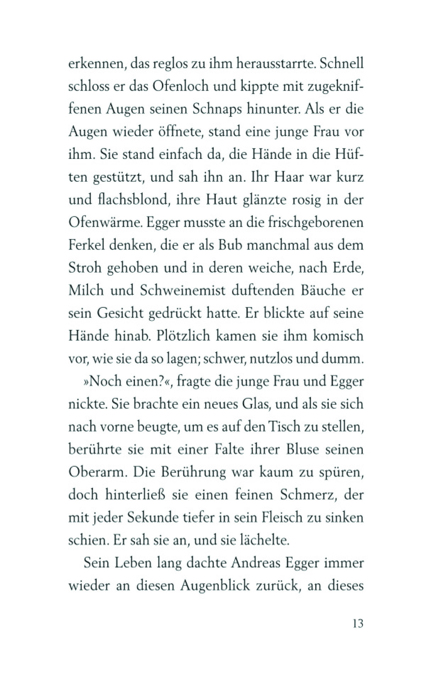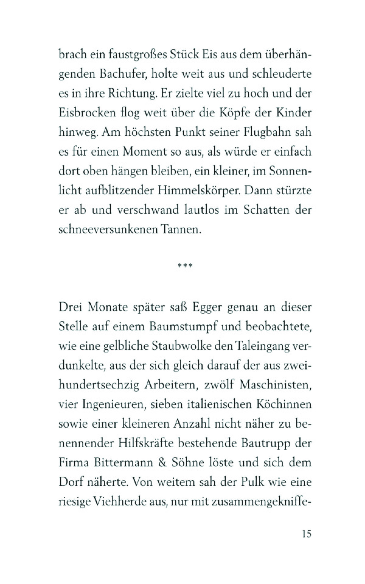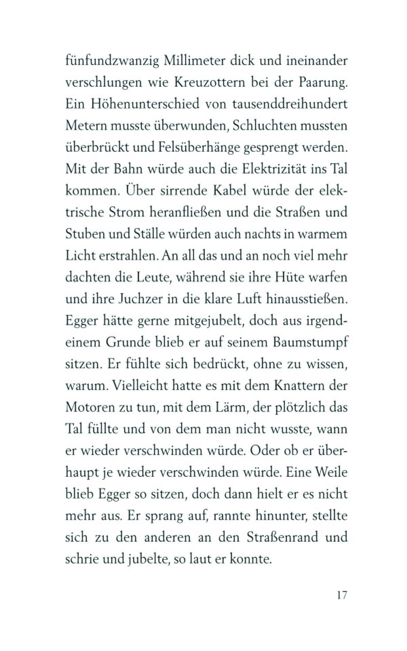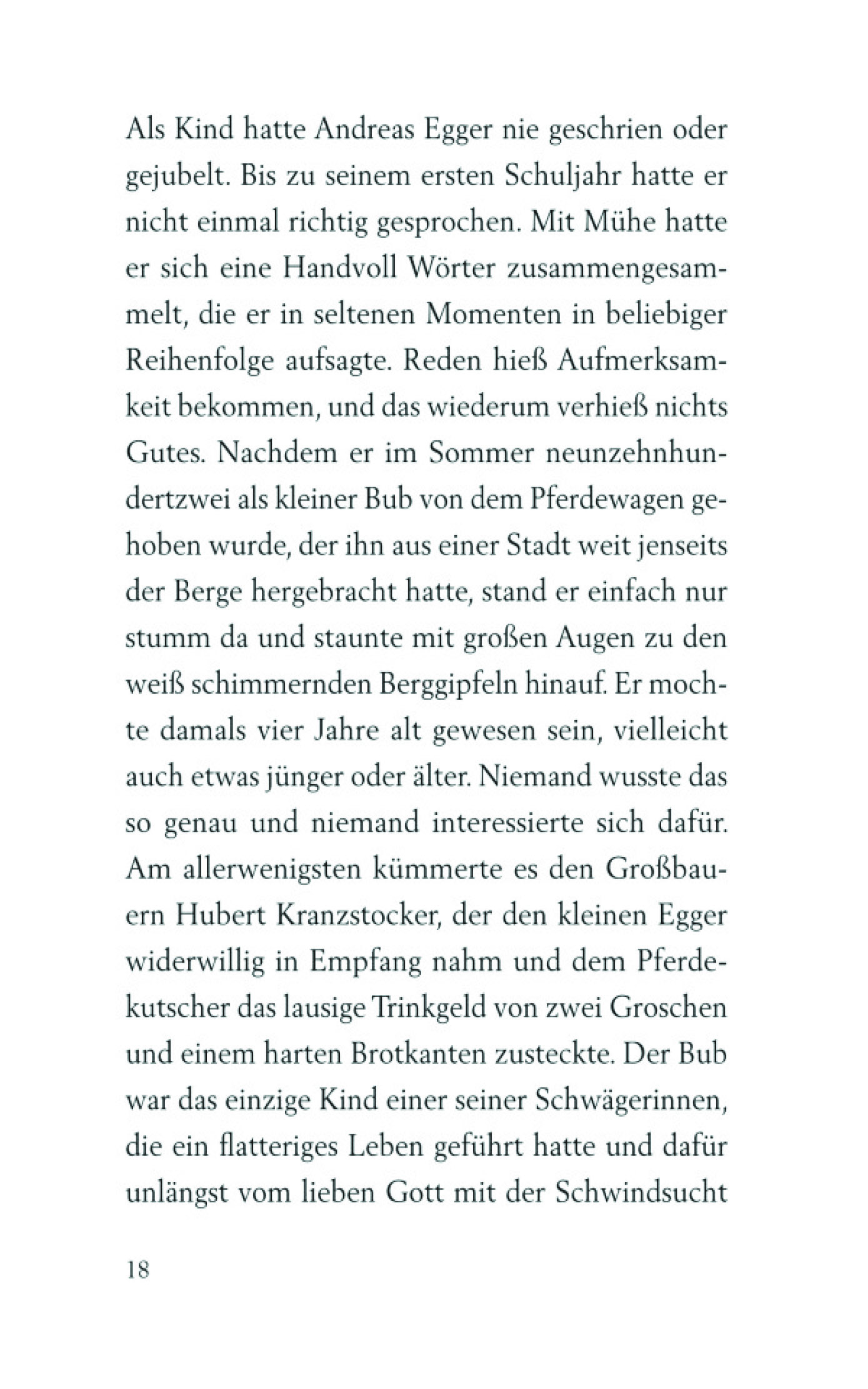 Als Andreas Egger in das Tal kommt, in dem er sein Leben verbringen wird, ist er vier Jahre alt, ungefähr - so genau weiß das keiner. Er wächst zu einem gestandenen Hilfsknecht heran und schließt sich als junger Mann einem Arbeitstrupp an, der eine der ersten Bergbahnen baut und mit der Elektrizität auch das Licht und den Lärm in das Tal bringt. Dann kommt der Tag, an dem Egger zum ersten Mal vor Marie steht, der Liebe seines Lebens, die er jedoch wieder verlieren wird. Erst viele Jahre später, als Egger seinen letzten Weg antritt, ist sie noch einmal bei ihm. Und er, über den die Zeit längst hinweggegangen ist, blickt mit Staunen auf die Jahre, die hinter ihm liegen.