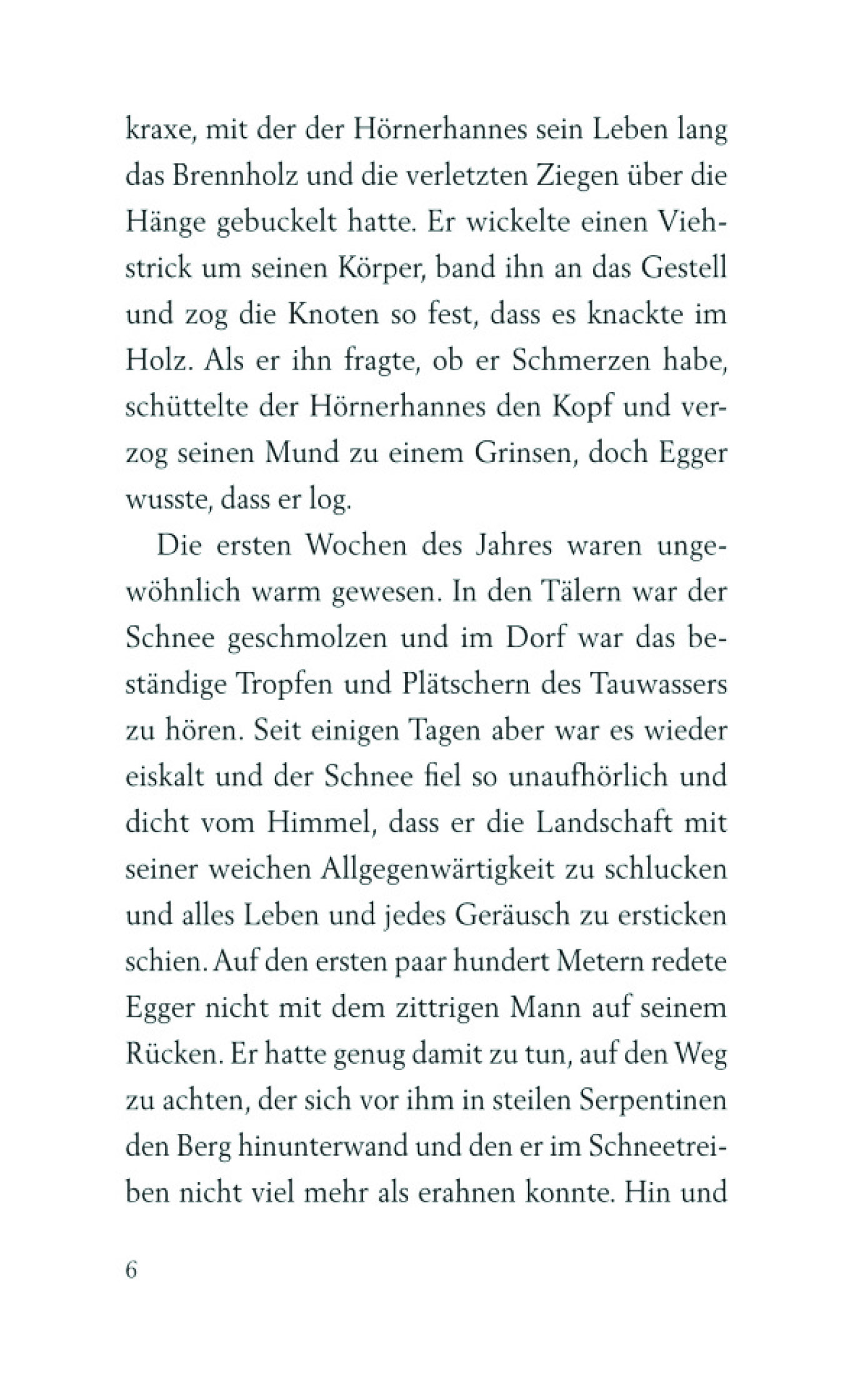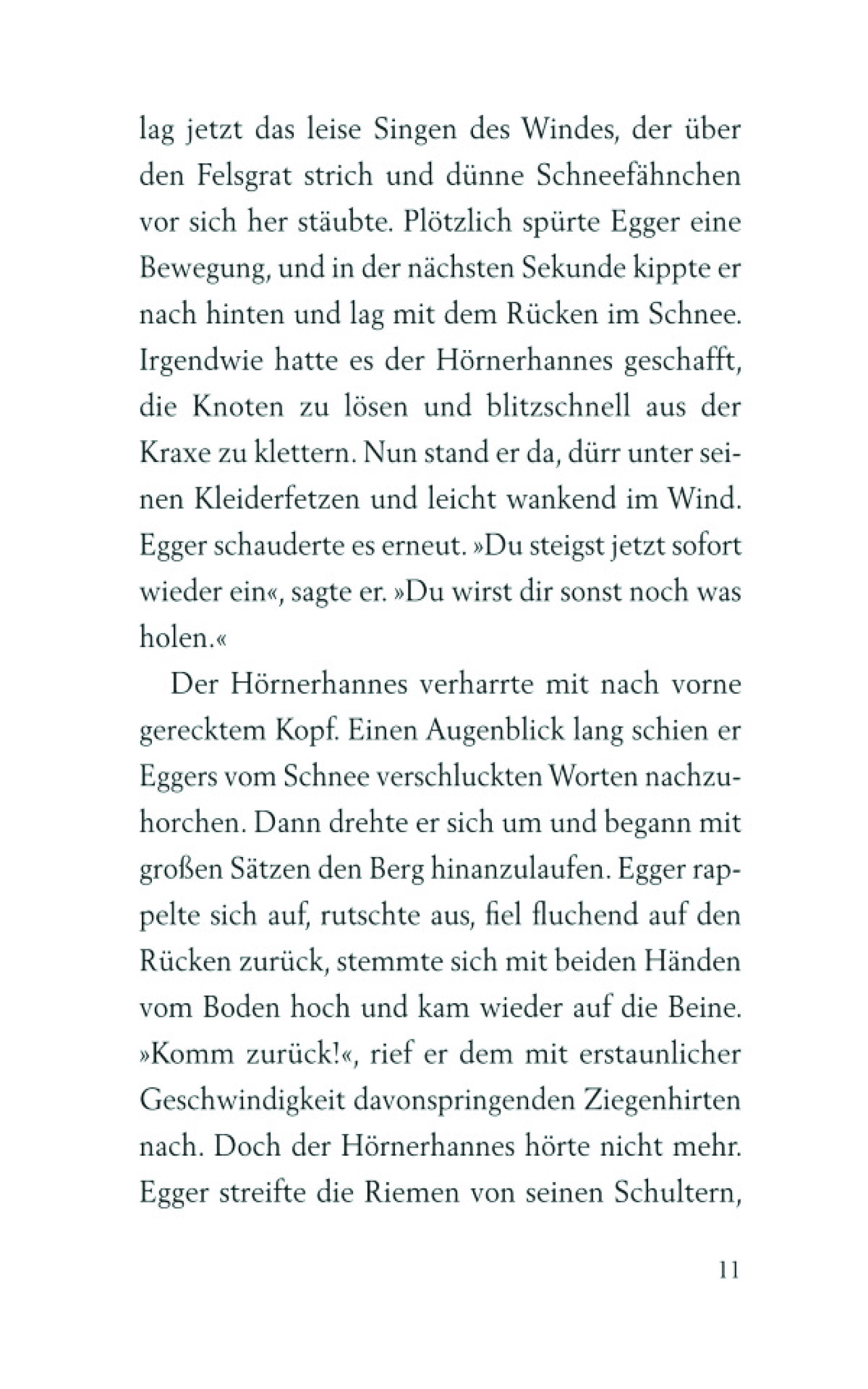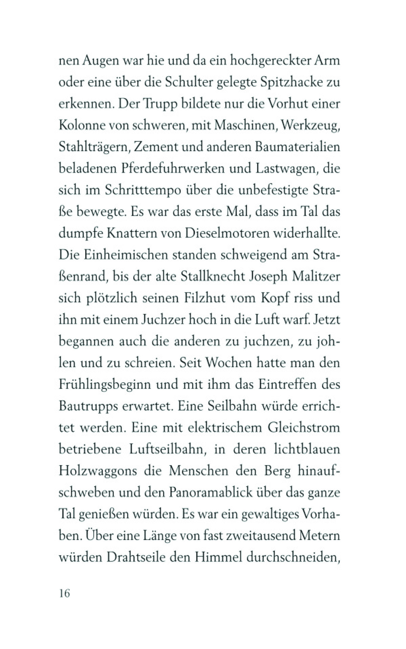 Als Andreas Egger in das Tal kommt, in dem er sein Leben verbringen wird, ist er vier Jahre alt, ungefähr - so genau weiß das keiner. Er wächst zu einem gestandenen Hilfsknecht heran und schließt sich als junger Mann einem Arbeitstrupp an, der eine der ersten Bergbahnen baut und mit der Elektrizität auch das Licht und den Lärm in das Tal bringt. Dann kommt der Tag, an dem Egger zum ersten Mal vor Marie steht, der Liebe seines Lebens, die er jedoch wieder verlieren wird. Erst viele Jahre später, als Egger seinen letzten Weg antritt, ist sie noch einmal bei ihm. Und er, über den die Zeit längst hinweggegangen ist, blickt mit Staunen auf die Jahre, die hinter ihm liegen.