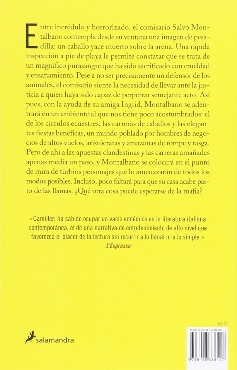 Entre incrédulo y horrorizado, el comisario Salvo Montalbano contempla desde su ventana una imagen de pesadilla: un caballo yace muerto sobre la arena. Una rápida inspección a pie de playa le permite constatar que se trata de un magnífico purasangre que ha sido sacrificado con crueldad y ensañamiento.