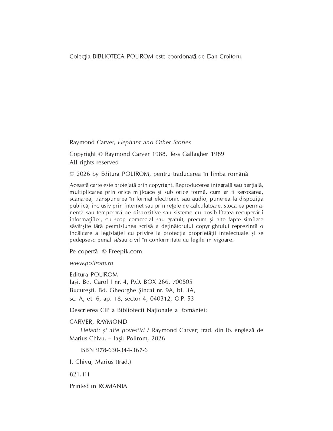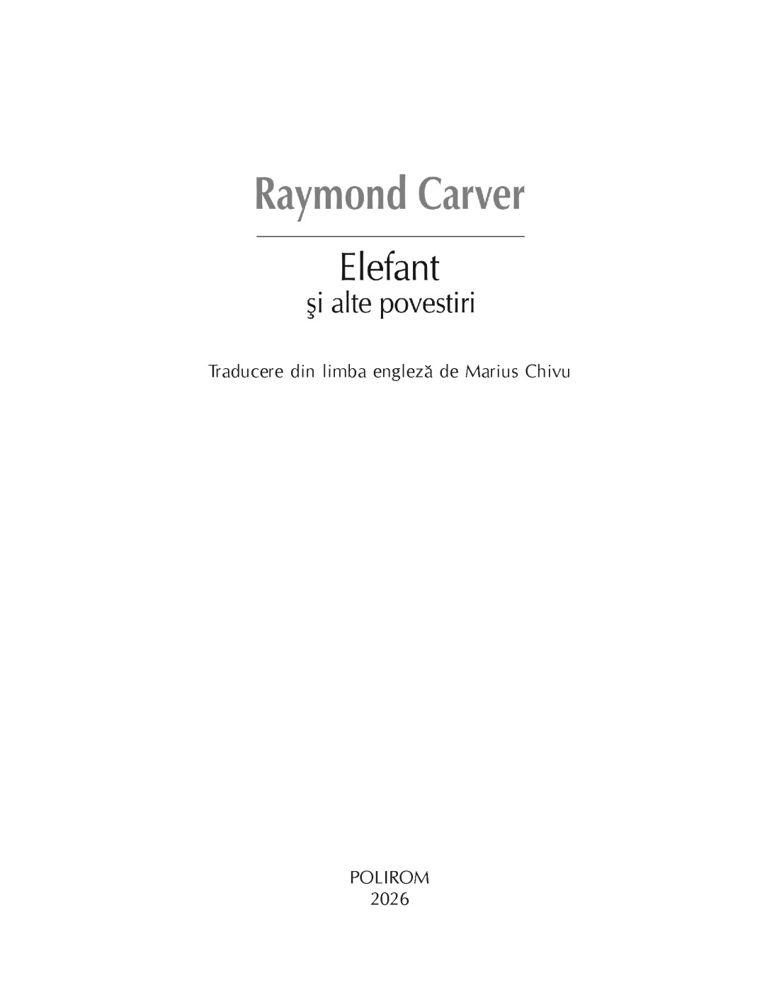 Raymond CARVER s-a născut în Clatskanie, Oregon, în 1938. La începutul anilor 1960, în California, a urmat cursuri de scriere creativă cu scriitorul John Gardner. A studiat apoi la Humboldt State College, California, şi la Iowa University. În anii 1970 a predat scriere creativă şi literatură la diferite universităţi. În 1976 publică Taci, te rog!, care îi aduce o largă recunoaştere. I-au urmat volumele Anotimpuri furioase (1977), Despre ce vorbim când vorbim despre iubire (1981), Catedrala (1983) şi Elefant şi alte povestiri (1988). Mai multe dintre povestirile lui Carver au fost adaptate pentru marele ecran şi pentru scenă. În 1993 apare filmul Short Cuts, cu Julianne Moore, Andie MacDowell, Bruce Davison, Jack Lemmon şi alţi mari actori, în regia lui Robert Altman. În 2014, este lansat lungmetrajul Birdman or (The Unexpected Virtue of Ignorance), regizat de Alejandro G. Iñárritu, avându-i în distribuţie pe Michael Keaton, Zach Galifianakis, Edward Norton, Andrea Riseborough, Amy Ryan, Emma Stone şi Naomi Watts. Filmul, care se deschide cu poemul lui Carver „Late Fragment” şi al cărui fir narativ principal îl reprezintă punerea în scenă, pe Brodway, a povestirii „Despre ce vorbim când vorbim despre iubire”, a obţinut multiple premii internaţionale, printre care Oscarul pentru cel mai bun film şi Globul de Aur pentru cel mai bun scenariu. Carver este şi autorul a cinci volume de poezie. A scris, de asemenea, eseuri. În 1983 i-a fost decernat prestigiosul Mildred and Harold Strauss Living Award, iar revista Poetry i-a acordat Levinson Prize, în 1985. În 1988 a fost primit în American Academy of Arts and Letters. A încetat din viaţă în 1988. La Editura Polirom au apărut, unele în mai multe ediţii, volumele Taci, te rog!, Despre ce vorbim când vorbim despre iubire şi Catedrala.