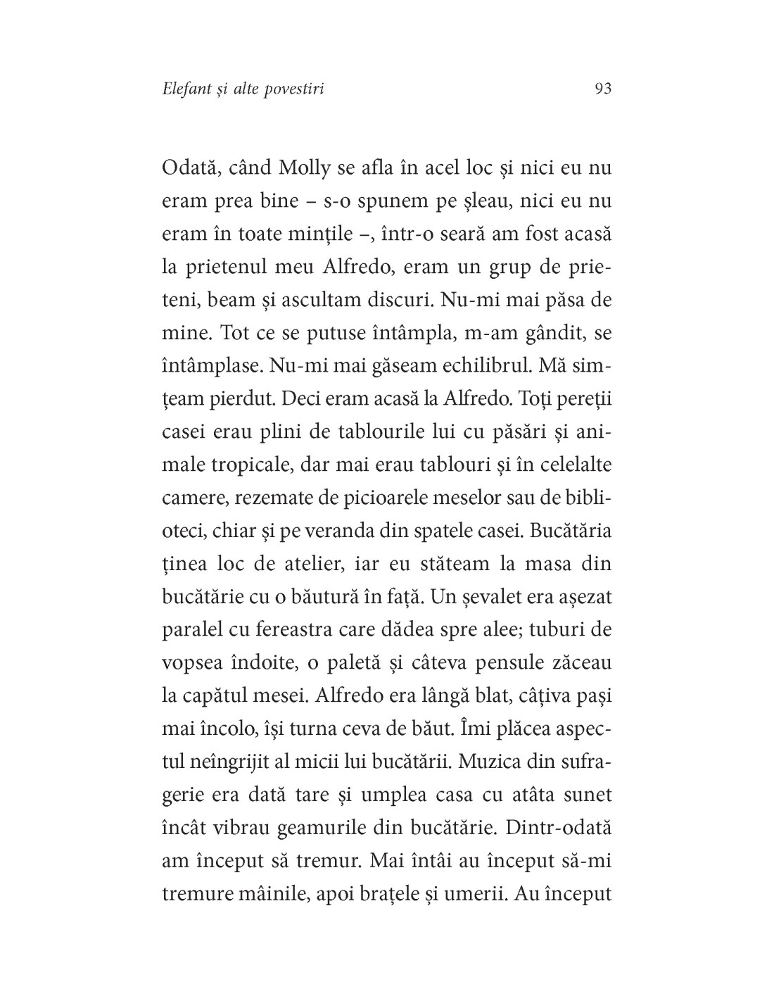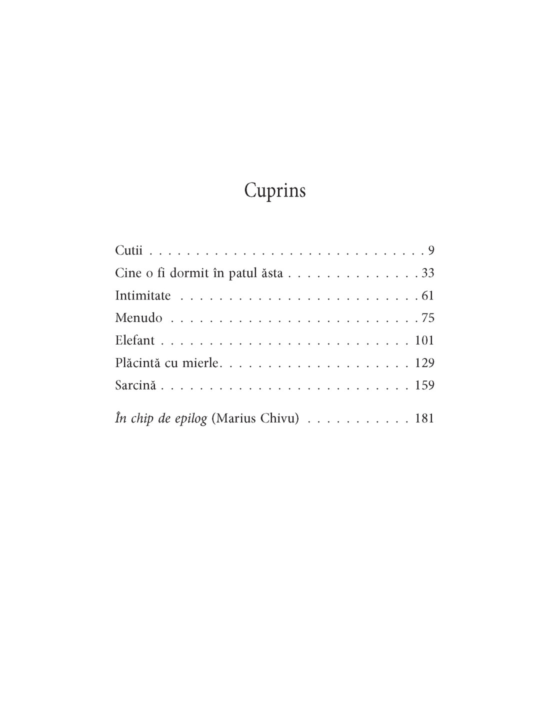 Păstrând economia stilistică, dar investind-o cu o emoţie mai intensă şi ironie tăioasă, Carver explorează prin intermediul lor situaţii de viaţă dintre cele mai diverse: un fiu prins între o mamă neliniştită şi o parteneră indiferentă („Cutii”), un scriitor care îşi exploatează fosta soţie în numele propriei opere („Intimitate”), un bărbat incapabil să-şi asume partea de responsabilitate în eşecul propriei căsnicii („Menudo”) sau un cap de familie împovărat de ajutorul financiar pe care îl oferă rudelor sale („Elefant”). În plus, printre aceste povestiri se numără şi una dintre cele mai lungi ale sale, „Sarcină”, prin intermediul căreia autorul îşi imaginează moartea lui Cehov, un scriitor pe care Carver îl admira profund şi a cărui operă a fost adesea comparată cu propria sa creaţie. Această povestire remarcabilă sugerează că unul dintre cei mai mari autori moderni de proză scurtă se pregătea probabil, în anul dinaintea sfârşitului său prematur, să scrie o operă mai amplă.