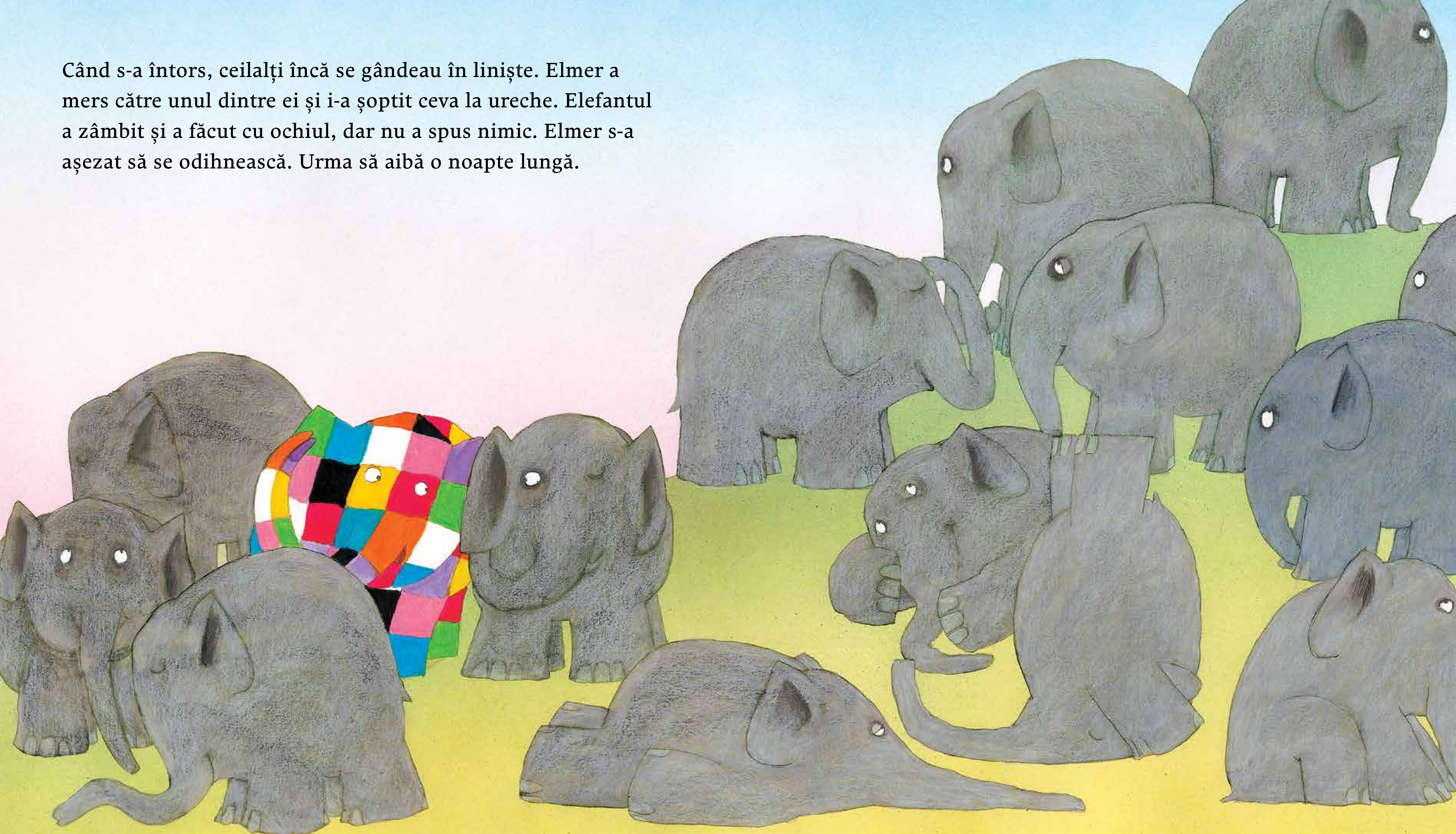 Se apropie ziua lui Elmer, când toți elefanții gri poartă culori strălucitoare. Pentru că se cam plictisește, Elmer pune la cale o farsă pentru ceilalți elefanți, în timp ce ei dorm...