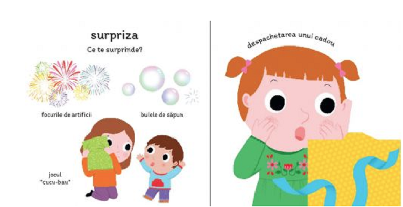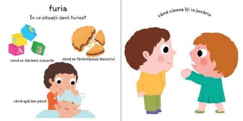 Pe fiecare pagină este reprezentată o emoție unică, astfel încât copilul să o poată recunoaște cu ușurință.