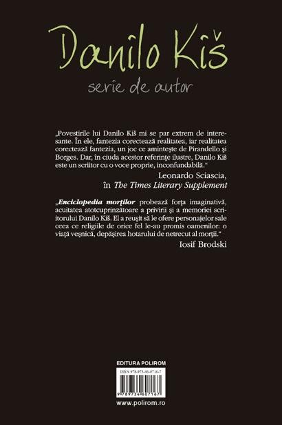 "Enciclopedia mortilor probeaza forta imaginativa, acuitatea atotcuprinzatoare a privirii si a memoriei scriitorului Danilo Kis. El a reusit sa le ofere personajelor sale ceea ce religiile de orice fel le-au promis oamenilor: o viata vesnica, depasirea hotarului de netrecut al mortii." (Iosif Brodski)