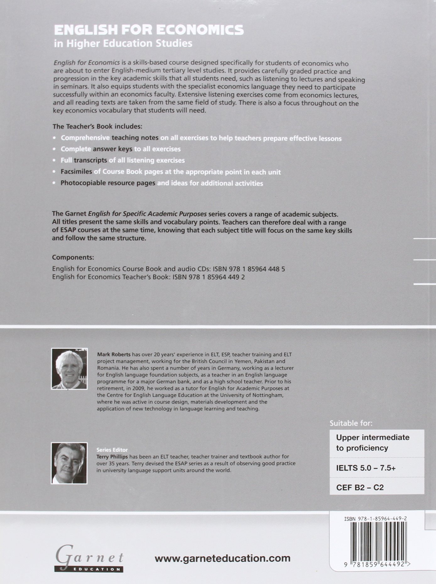 English for Economics in Higher Education Studies The Garnet Education English for Specific Academic Purposes series won the Duke of Edinburgh English Speaking Union English Language Book Award in 2009. English for Economics is a skills-based course designed specifically for students of economics who are about to enter English-medium tertiary level studies. It provides carefully graded practice and progressions in the key academic skills that all students need, such as listening to lectures and speaking in seminars. It also equips students with the specialist economics language they need to participate successfully within a economics faculty. Extensive listening exercises come from economics lectures, and all reading texts are taken from the same field of study. There is also a focus throughout on the key economics vocabulary that students will need. The Teacher's Book includes: Comprehensive teaching notes on all exercises to help teachers prepare effective lessons Complete answer keys to all exercises Full transcripts of listening exercises Facsimiles of Course Book pages at the appropriate point in each unit Photocopiable resource pages and ideas for additional activities The Garnet English for Specific Academic Purposes series covers a range of academic subjects. All titles present the same skills and vocabulary points. Teachers can therefore deal with a range of ESAP courses at the same time, knowing that each subject title will focus on the same key skills and follow the same structure. Key Features Systematic approach to developing academic skills through relevant content. Focus on receptive skills (reading and listening) to activate productive skills (writing and speaking) in subject area. Eight-page units combine language and academic skills teaching. Vocabulary and academic skills bank in each unit for reference and revision. Audio CDs for further self-study or homework. Ideal coursework for EAP teachers. Contents Unit 1: Economics in the modern world Unit 2: How economics is organized Unit 3: Market economics Unit 4: Economics and technology Unit 5: Economics, globalization and sustainable development Unit 6: Macroeconomics ... but microfinance! Unit 7: Saving, spending ... borrowing and lending! Unit 8: The economics of agriculture Unit 9: The economics of healthcare Unit 10: Economics and sport Unit 11: Labour markets Unit 12: Strategy, policy and economic change