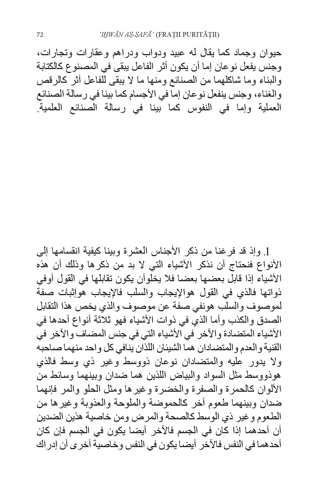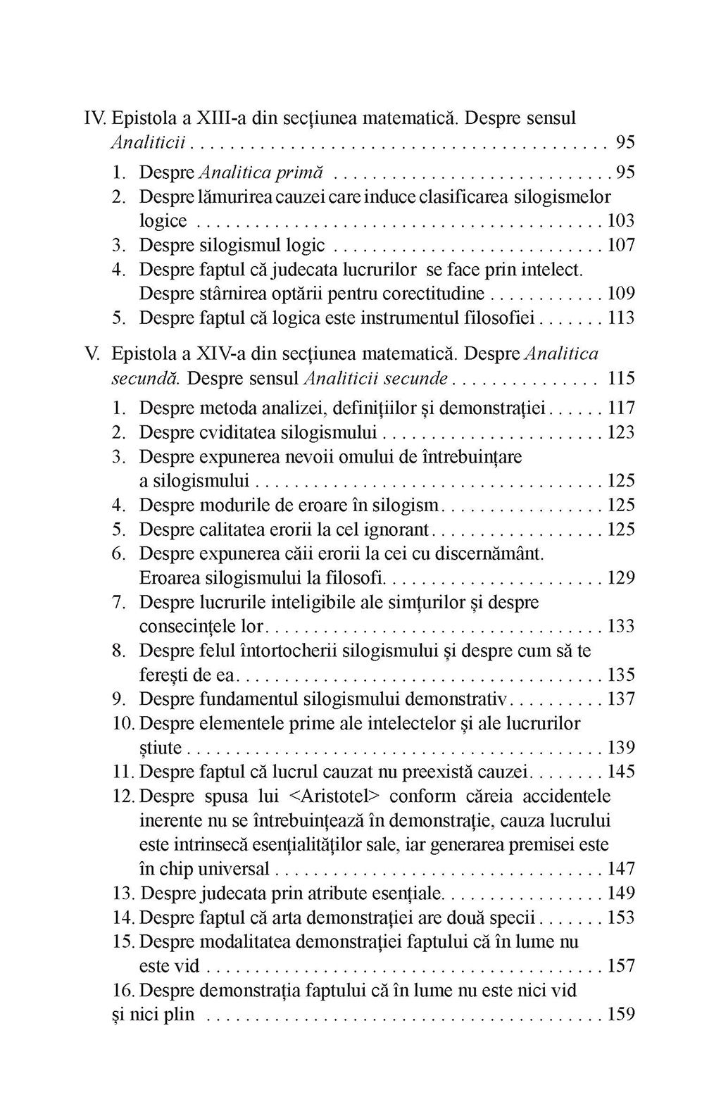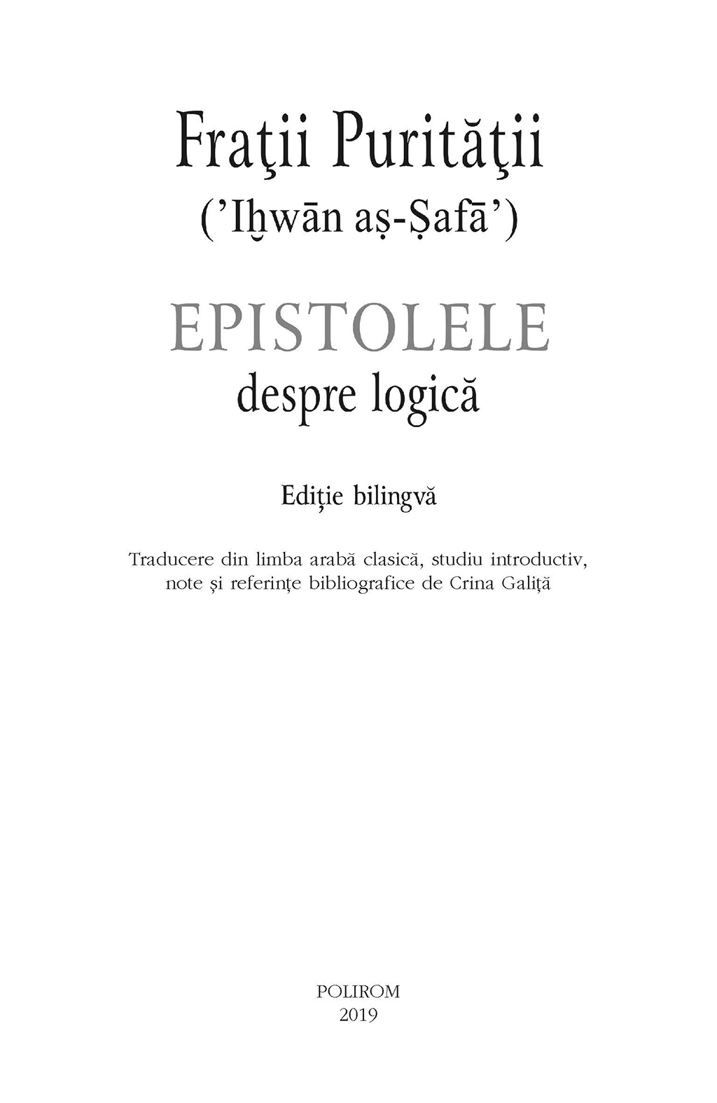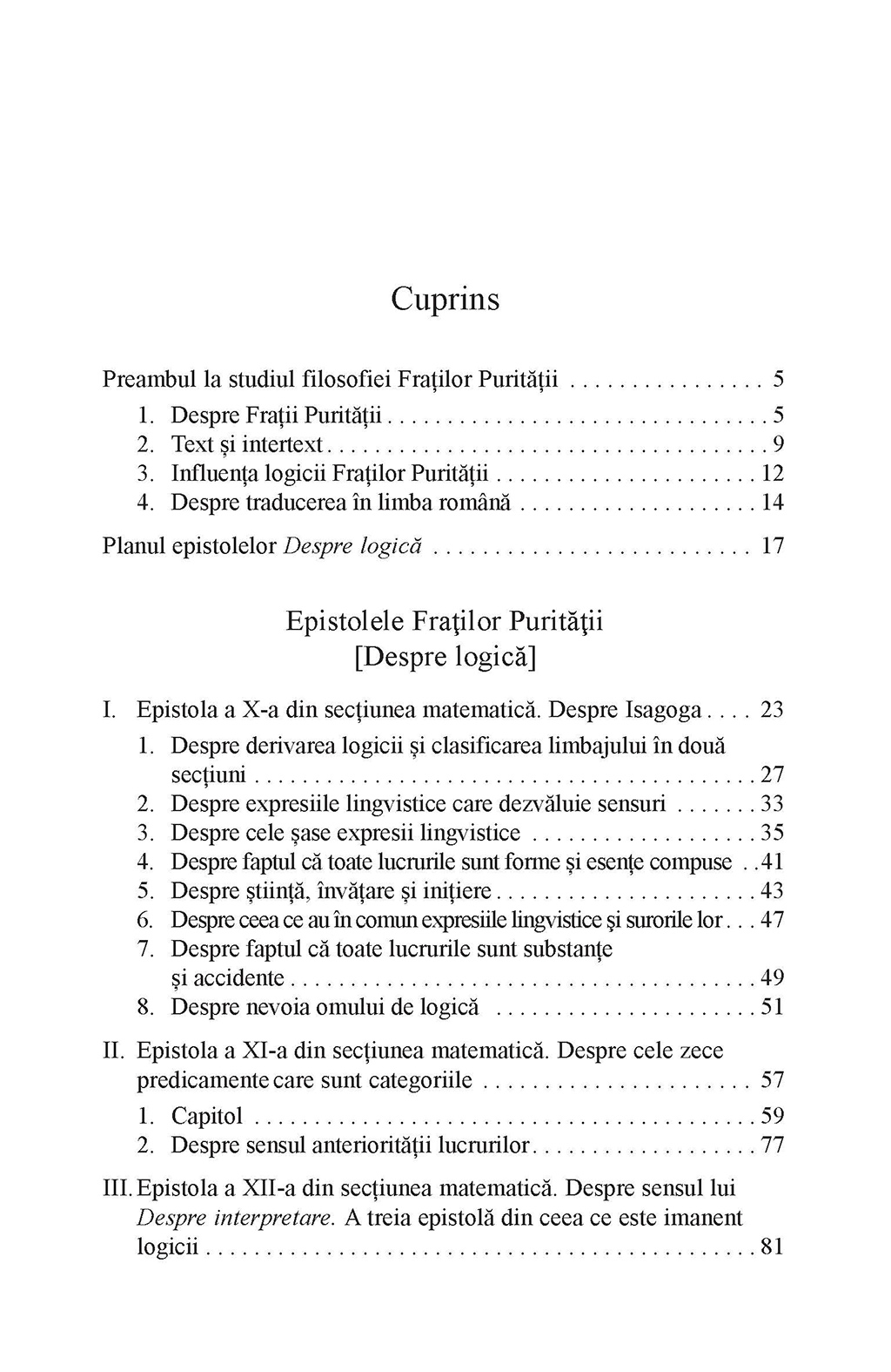 Fragmentul Despre logică din Epistolele Fraților Purității marchează debutul studiului logicii din spațiul cultural arab al secolului al X-lea. El expune percepția acestui grup intelectual asupra instrumentului filosofiei și reflectă una dintre primele etape de creație în filosofia arabă după valul de traduceri din filosofia elină, prin intermediar siriac. Volumul cuprinde traducerea ultimelor cinci epistole (X-XIV), din secțiunea „Ar-rasā’ilu r-riyāḍiyyatu” („Epistolele despre <științele> matematice”) a enciclopediei Rasāil („Epistole”), după ediția lui Khairaddīn Az-Ziriklī.