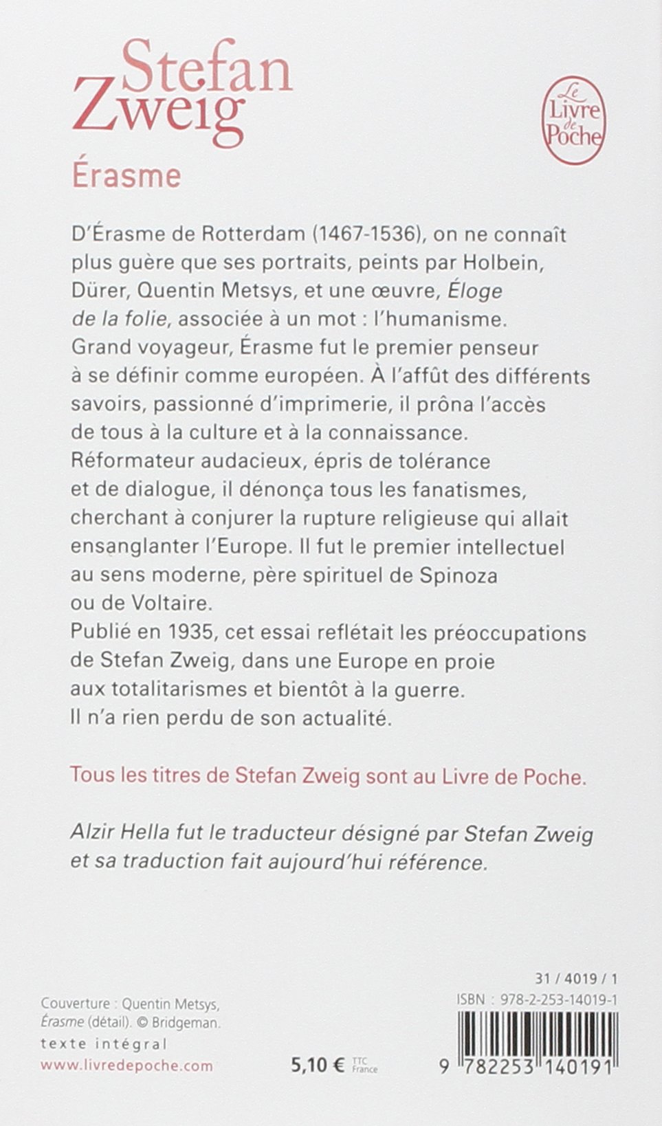 D’Érasme de Rotterdam (1467-1536), on ne connaît plus guère que ses portraits peints par Holbein, Dürer, Quentin Metsys, son ami, et une Œuvre, Éloge de la folie, associée à un mot : l’humanisme. De cette figure marquante de la Renaissance, Stefan Zweig nous donne un portrait qui lui restitue toute sa dimension. Grand voyageur, Érasme fut le premier penseur à se définir comme Européen. À l’affût des différents savoirs, passionné d’imprimerie, il prôna l’accès de tous à la culture et à la connaissance. Réformateur audacieux, mais épris de tolérance et de dialogue, il dénonça tous les fanatismes, chercha à conjurer la rupture religieuse qui allait ensanglanter l’Europe. Il fut le premier intellectuel au sens moderne, père spirituel de Spinoza ou de Voltaire. Publié en 1935, cet essai reflétait les préoccupations de l’écrivain autrichien, dans une Europe en proie aux totalitarismes et bientôt à la guerre. Il n’a rien perdu de son actualité.