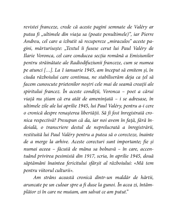 Auzisem vorbindu-se despre lumi în întregime dispărute, de imperii scufundate laolaltă cu toate popoarele și zămislirile lor; scoborâte în străfundul inexplorabil al veacurilor împreună cu zeii și cu legile lor, cu academiile și științele pure și aplicate, cu gramaticile, cu dicționarele, cu clasicii, cu romanticii și cu simboliștii lor, cu criticii și cu criticii criticilor lor. Știam prea bine că întreg pământul ce se vede este făcut din cenușă, că cenușa înseamnă ceva. (…) Atâtea orori nu ar fi fost cu putință fără atâtea virtuți. A trebuit, neîndoielnic, multă știință pentru a ucide atâția oameni, pentru a risipi atâtea bunuri, pentru a nimici atâtea orașe în atât de puțin timp; dar au trebuit nu mai puține calități morale. A ști și A trebui, sunteți, așadar, suspecte?
