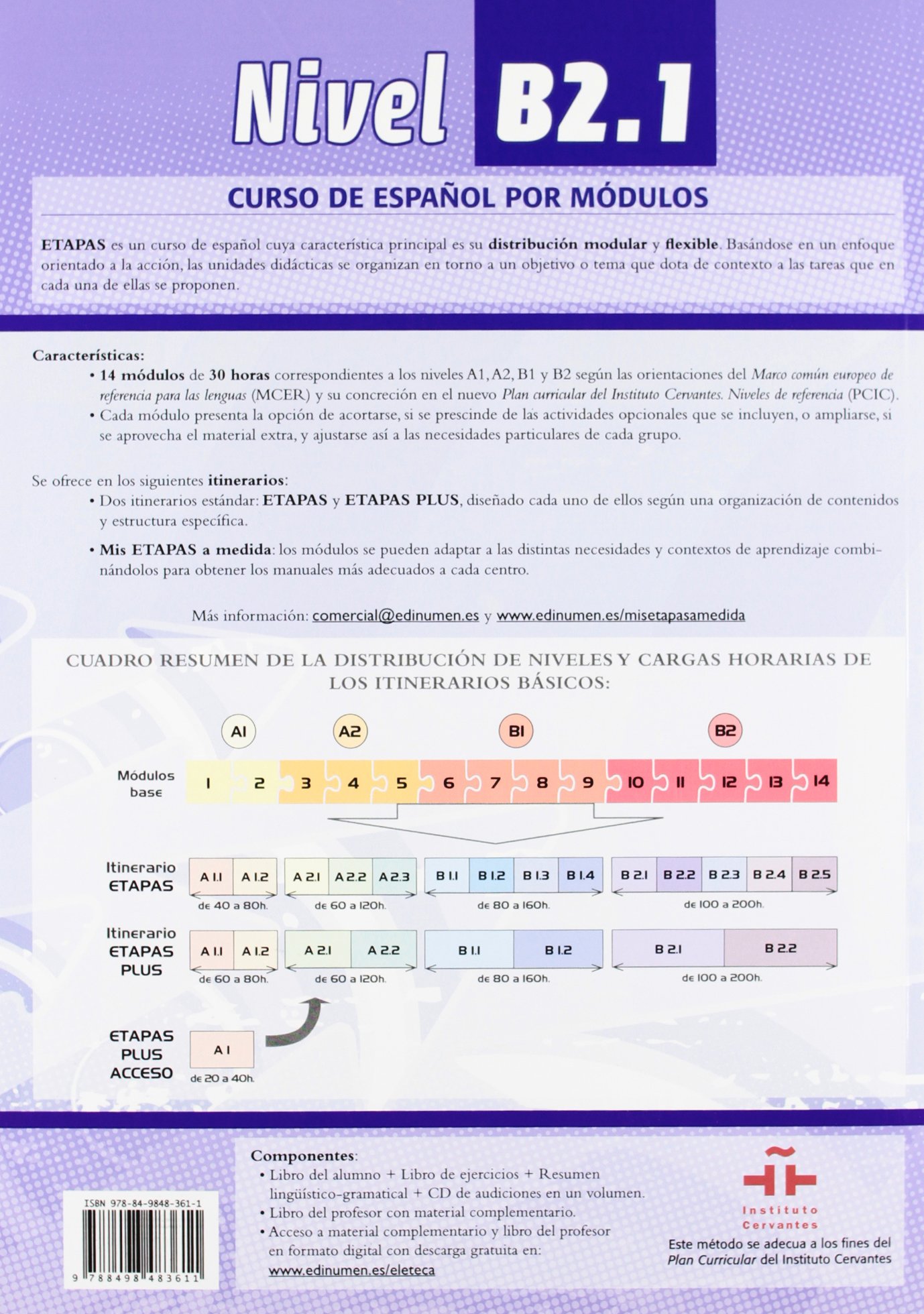Caracteristicas : 14 modulos de 30 horas correspondientes a los niveles A1, A2,B1 y H2 segun las orientaciones del Marco comun europeo de referencia para las lenguas (MCER) y su concrecion en el nuovo Plan curricular del Instituto Cervantes : Niveles de referencia (PCIC). Cada modulo presenta la opcion de acortarse, si se prescinde de las actividades opcionales que se incluyen, o ampliarse, si se aprovecha et material extra, y ajustarse asi a las necesidades particulares de cala grupo. Se ofrece en los siguientes itinerarios : dos itinerarios estandar: Etapas y Etapas Plus, disenado cala uno de ellos segun una organizacion de contenidos y estructura especifica. Mis Etapas a medida : los modulos se pueden adaptar a las distintas necesidades y contextos de aprendizaje combinandolos para obtener los manuales mas adecuados a cada centro.