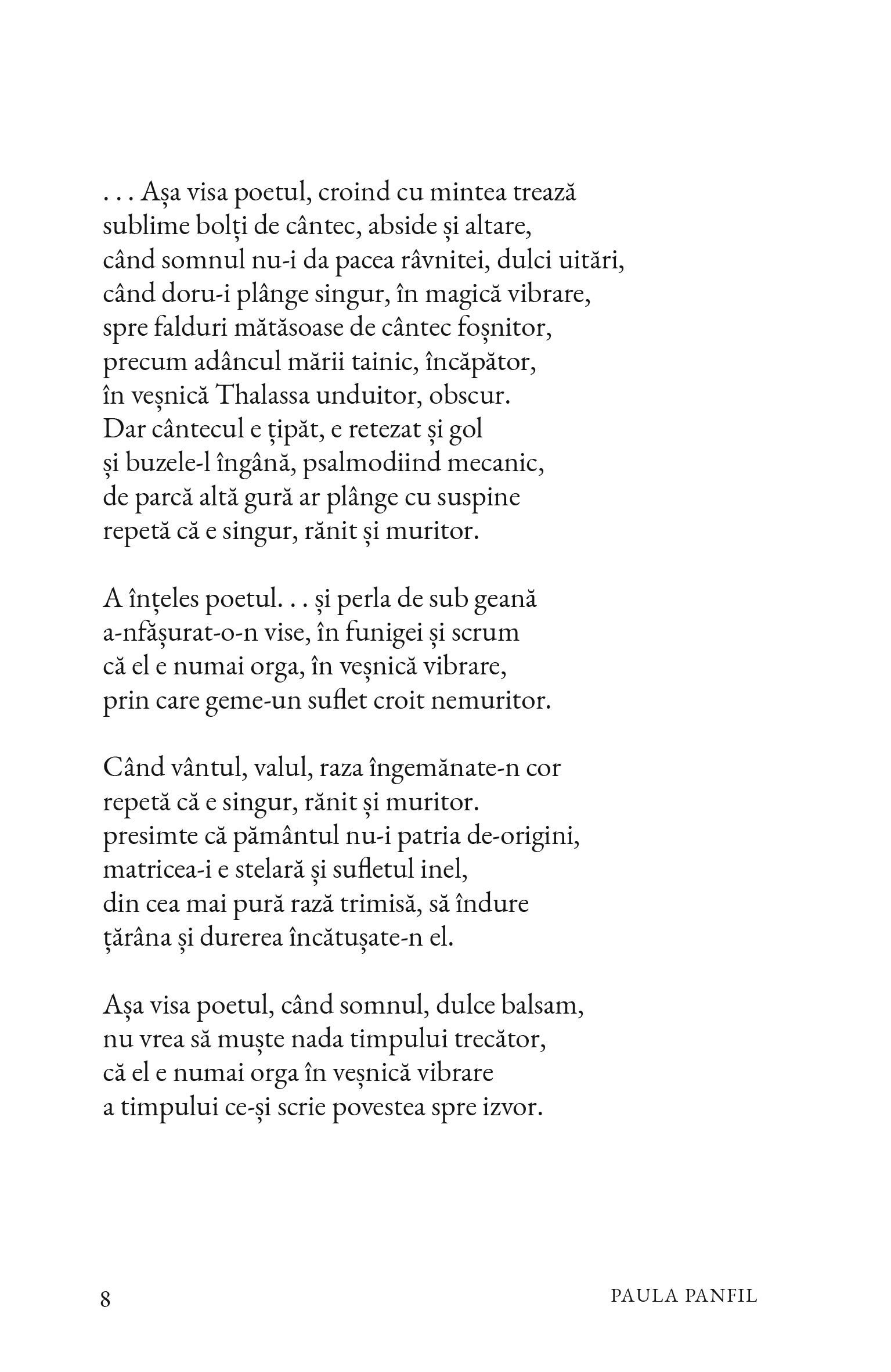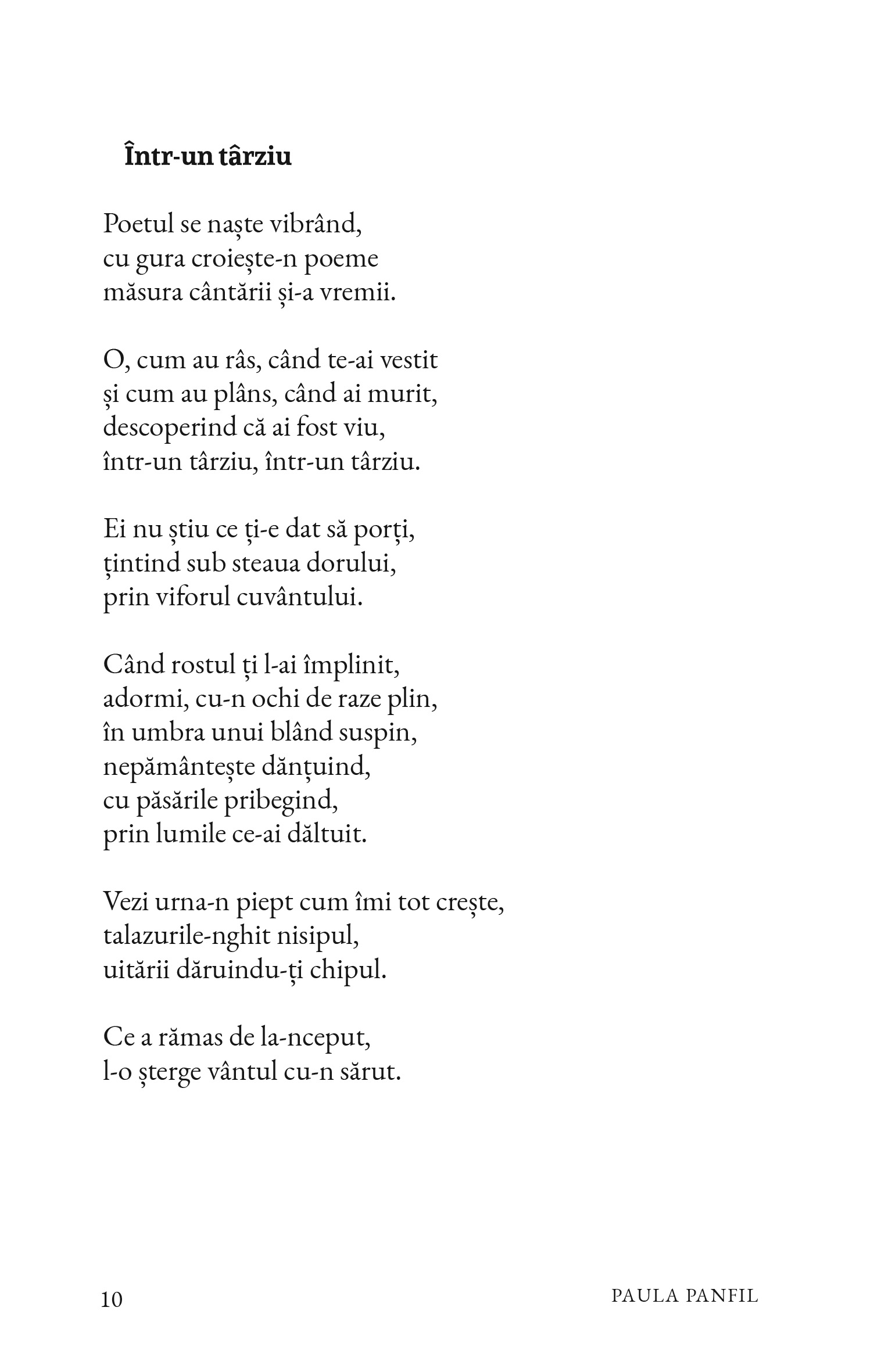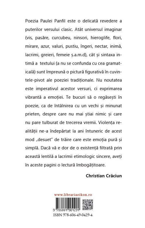 Poezia Paulei Panfil este o delicată revedere a puterilor versului clasic. Atât universul imaginar (vis, pasăre, curcubeu, ninsori, hieroglife, flori, mirare, azur, valuri, pustiu, îngeri, nectar, inimă, lacrimi, greieri, femeie ș.a.m.d), cât și sintaxa intimă a textului (a nu se confunda cu cea gramaticală) sunt împreună o pictură figurativă în cuvintele-pivot ale poeziei tradiționale. Nu noutatea este imperativul acestor versuri, ci exprimarea vibrantă a emoției. Te bucuri să o regăsești în poezie, ca de întâlnirea cu un vechi și minunat prieten, despre care nu mai știai nimic și care nu pare tulburat de trecerea vremii. Violența realității ne-a îndepărtat la ani întuneric de acest mod „desuet” de trăire care este emoția pură și simplă. Dacă vă e dor de o existență filtrată prin această lentilă a lacrimii etimologic sincere, aveți în aceste pagini o lectură îmbogățitoare. (Christian Crăciun)