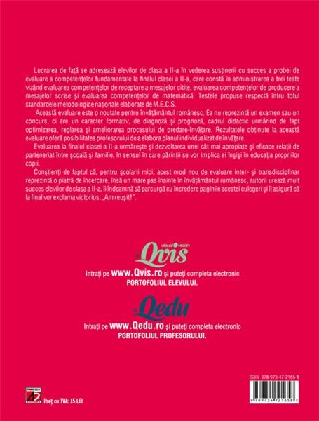 Constienti de faptul ca, pentru scolarii mici, acest mod nou de evaluare inter- si trans-disciplinar reprezinta o piatra de incercare, insa un mare pas inainte in invatamantul romanesc, autorii ureaza mult succes elevilor de clasa a II-a, ii indeamna sa parcurga cu incredere paginile acestei culegeri si ii asigura ca la final vor exclama victorios: Am reusit!
