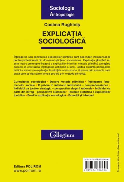Intelegerea sau construirea explicatiilor stiintifice sint deprinderi indispensabile pentru profesionistii din domeniul stiintelor socioumane. Explicatia stiintifica nu este insa o prelungire fireasca a explicatiilor intuitive, metoda stiintifica ajungind deseori sa contrazica intelegerea cotidiana a lumii. Cartea prezinta principalele tactici si riscuri ale explicatiei in stiintele socioumane, ilustrate prin exemple care arata cum se dezvaluie lumea sociala prin metoda stiintifica.