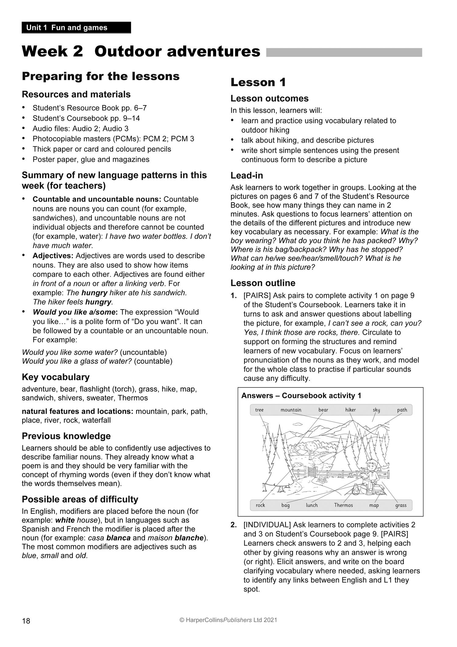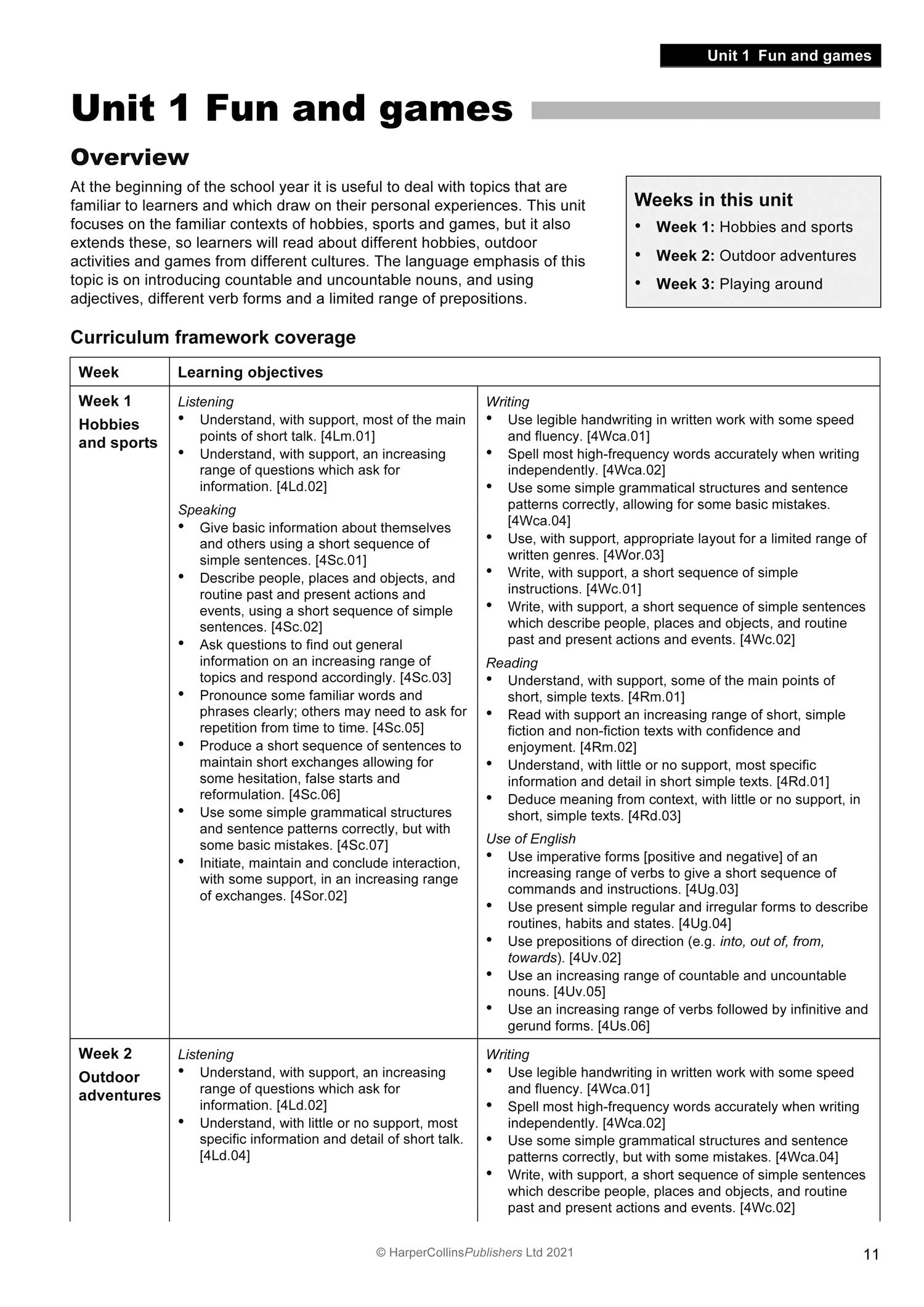 The material at each level is organised into nine units, each of which is divided into three weeks. Four suggested lessons are provided in the Teacher’s Guide for each week of work, plus a further section of additional activities, revision and extension offering further resources which can be used flexibly depending on the timetable or classroom context. Step-by-step lesson notes give clear instructions for using the materials and to fully cover the curriculum. The activities in each unit are introduced and explored in context so that language is developed and learnt in meaningful and familiar contexts related to learners’ interests and what they may be learning in other school subjects.