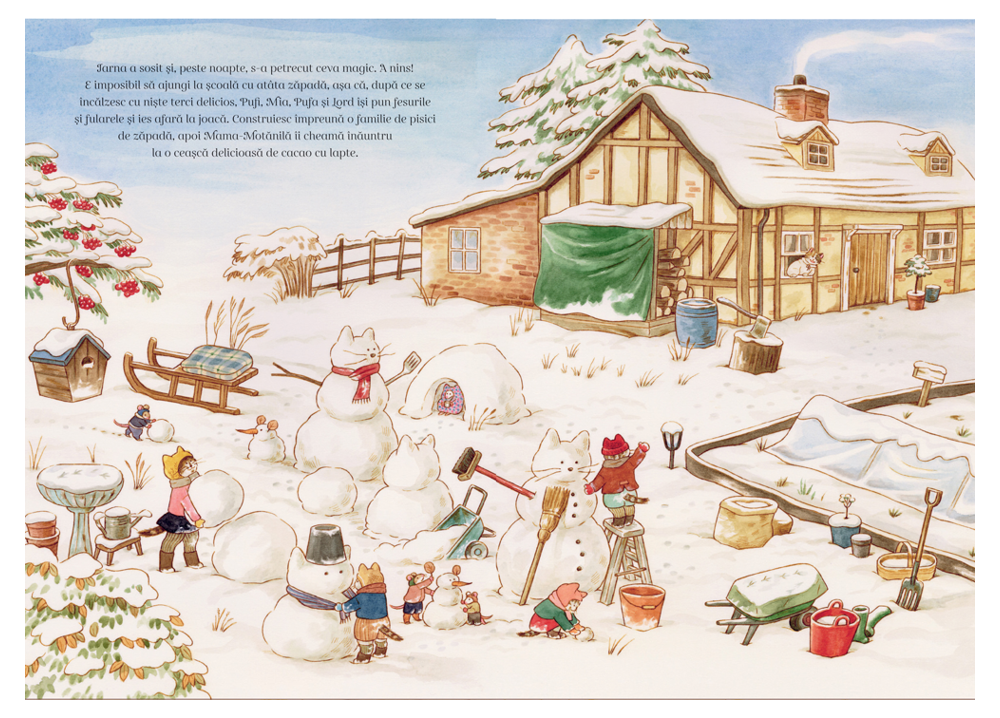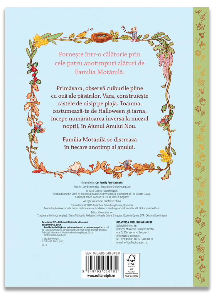 Pornește într-o călătorie prin cele patru anotimpuri alături de simpatica Familie Motănilă! Cartea surprinde magia fiecărei perioade a anului prin activități, tradiții și aventuri de familie: de la primăvara plină de flori și Festivalul pălăriilor, la vacanțele de vară la mare, toamna cu roade bogate și costume de Halloween, până la iarna albă, Crăciunul cald și sărbătoarea de Anul Nou.