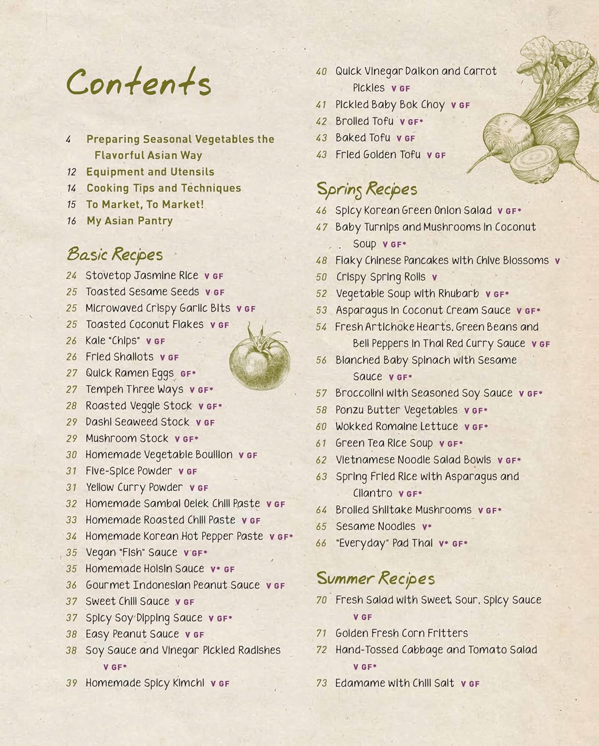 She shows you how to buy and use the freshest in-season produce to create delicious dishes with startlingly new flavors and textures by adding a few 'secret ingredients'--the traditional sweet, sour, spicy, savory seasonings that every Asian cook knows. She also explains in this Asian cookbook how the use of contrasting textures (for example silky tofu with crunchy peanuts) can create greater food enjoyment and a stimulating new dining experience.