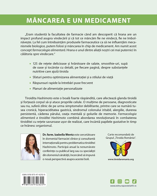 Tiroidita Hashimoto este o boală foarte răspândită, care afectează glanda tiroidă și forțează corpul să-și atace propriile celule. O mulțime de persoane, diagnosticate sau nu, suferă zilnic de pe urma simptomelor debilitante, printre care se numără tusea cronică, hiperaciditatea gastrică, sindromul colonului iritabil, alergiile, durerea persistentă, căderea părului, ceața mentală și golurile de memorie. Farmacologia alimentară a tiroiditei Hashimoto combină abordarea revoluționară în combaterea tiroiditei cu rețete savuroase ușor de realizat, care încântă papilele gustative în timp ce hrănesc organismul.