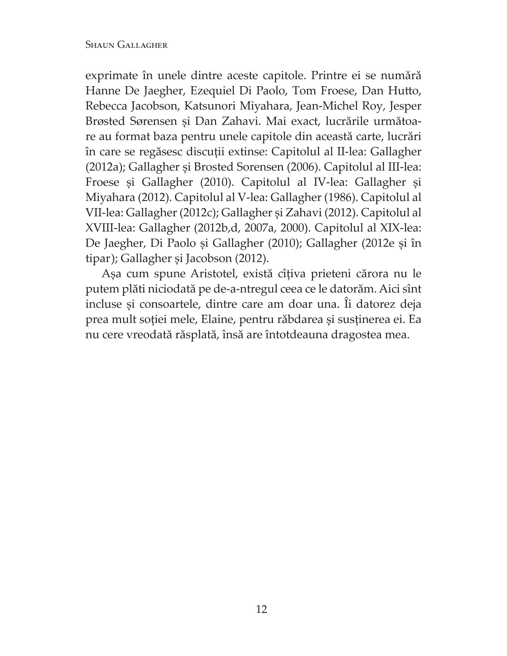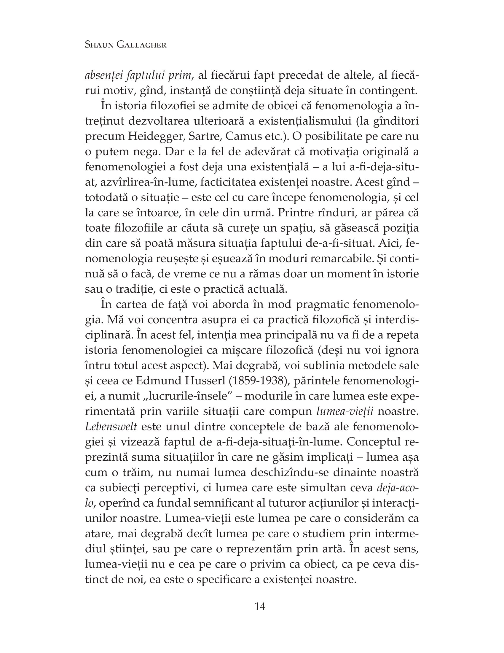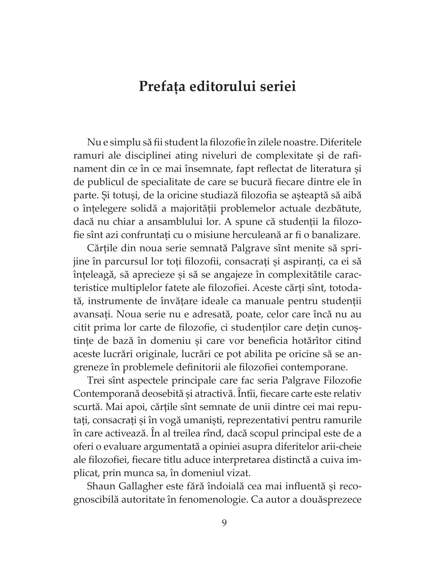 Deși fenomenologia este în mod tradițional asociată cu anumite ramuri ale filozofiei, mai cu seamă cu estetica, existențialismul și chiar psihanaliza, Gallagher insistă asupra felului în care fenomenologia poate juca un rol productiv ca parte a practicii științifice. Pornind de la premisa fundamentală că experiența umană este modelată de fenomenul intersubiectivității, autorul susține că tendințele reducționiste ale științei ar trebui respinse și că recenta evoluție a utilizării practice și științifice a fenomenologiei poate juca un rol decisiv în acest proiect. (Vittorio Bufacchi, Colegiul Universitar din Cork)