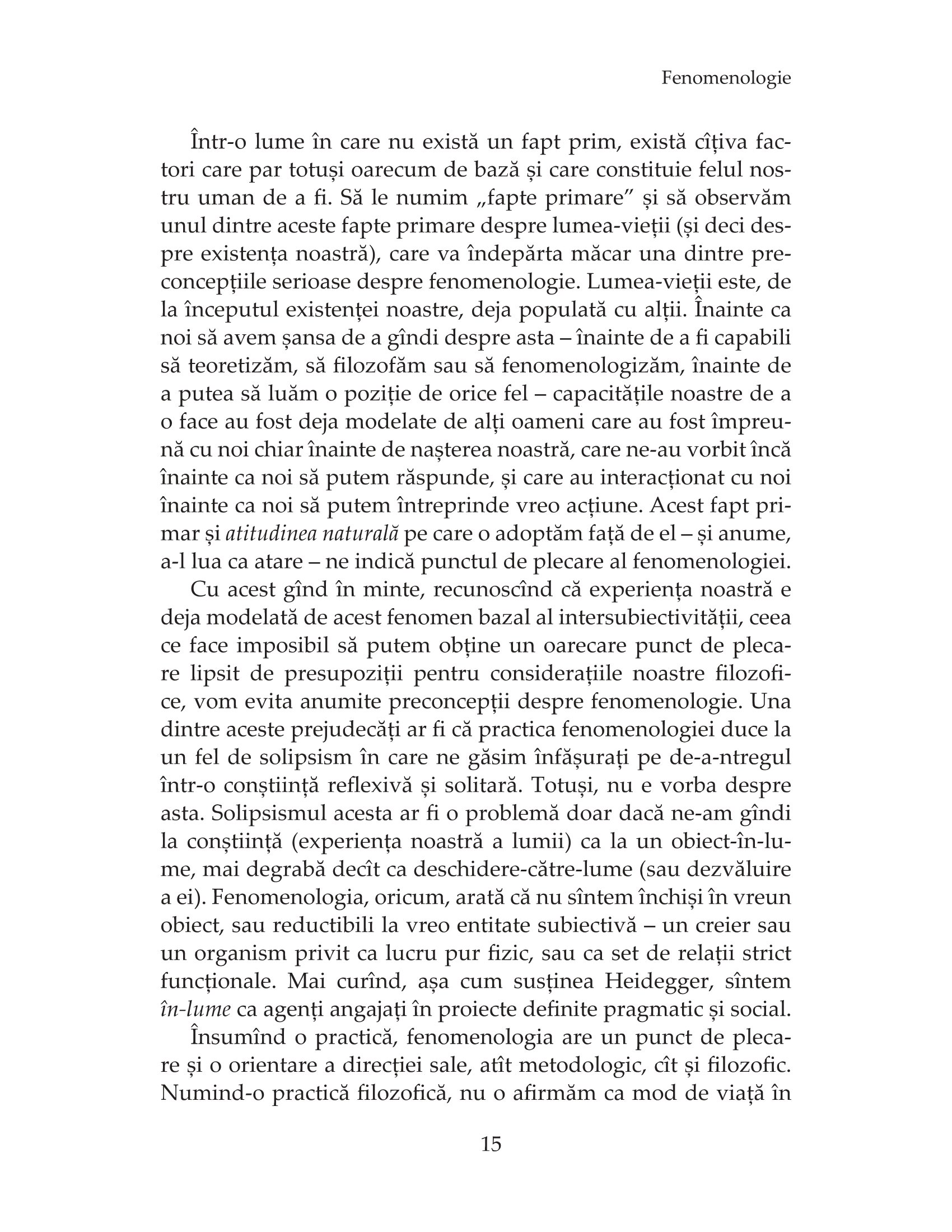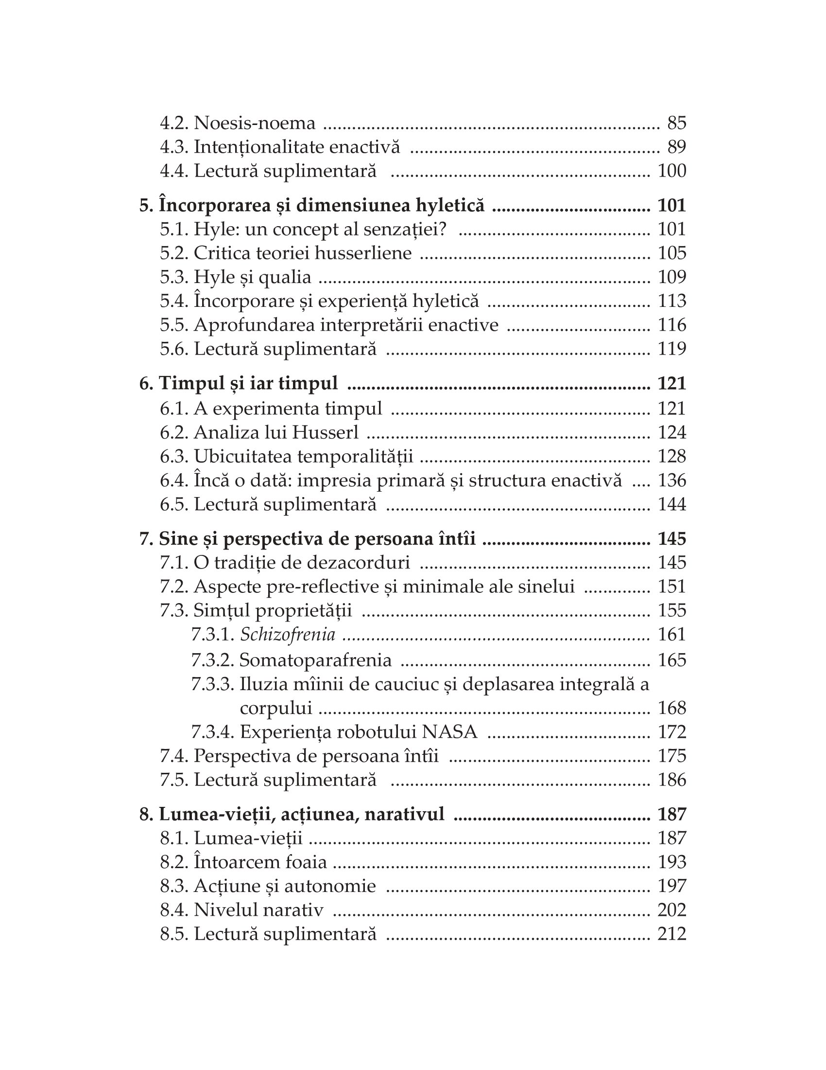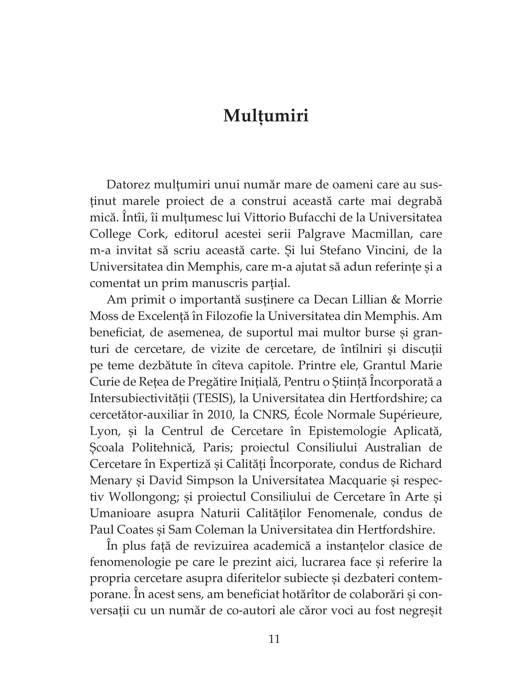 Deși fenomenologia este în mod tradițional asociată cu anumite ramuri ale filozofiei, mai cu seamă cu estetica, existențialismul și chiar psihanaliza, Gallagher insistă asupra felului în care fenomenologia poate juca un rol productiv ca parte a practicii științifice. Pornind de la premisa fundamentală că experiența umană este modelată de fenomenul intersubiectivității, autorul susține că tendințele reducționiste ale științei ar trebui respinse și că recenta evoluție a utilizării practice și științifice a fenomenologiei poate juca un rol decisiv în acest proiect. (Vittorio Bufacchi, Colegiul Universitar din Cork)
