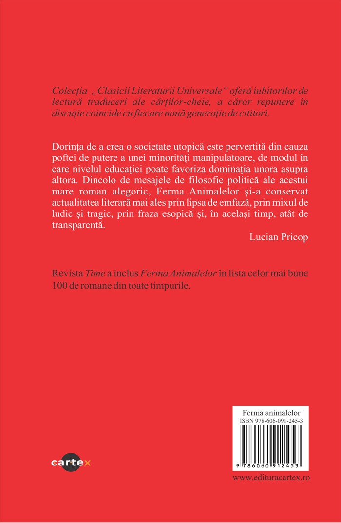 Insa Ferma Animalelor a fost „proiectat sa parodieze tradarea idealurilor socialiste de catre regimul sovietic“, iar tonul parodic este formula discursiva dominanta, intentia fiind transparenta: satirizarea Revolutiei ruse; in acelasi timp, dincolo de intentia auctoriala, romanul “are o aplicatie mai larga in masura in care (el) a insemnat ca acel tip de revolutie (revolutie conspirative violenta, condusa de oameni inconstienti, infometati de putere) nu poate duce decat la o schimbare de stapani”. - Lucian Pricop
