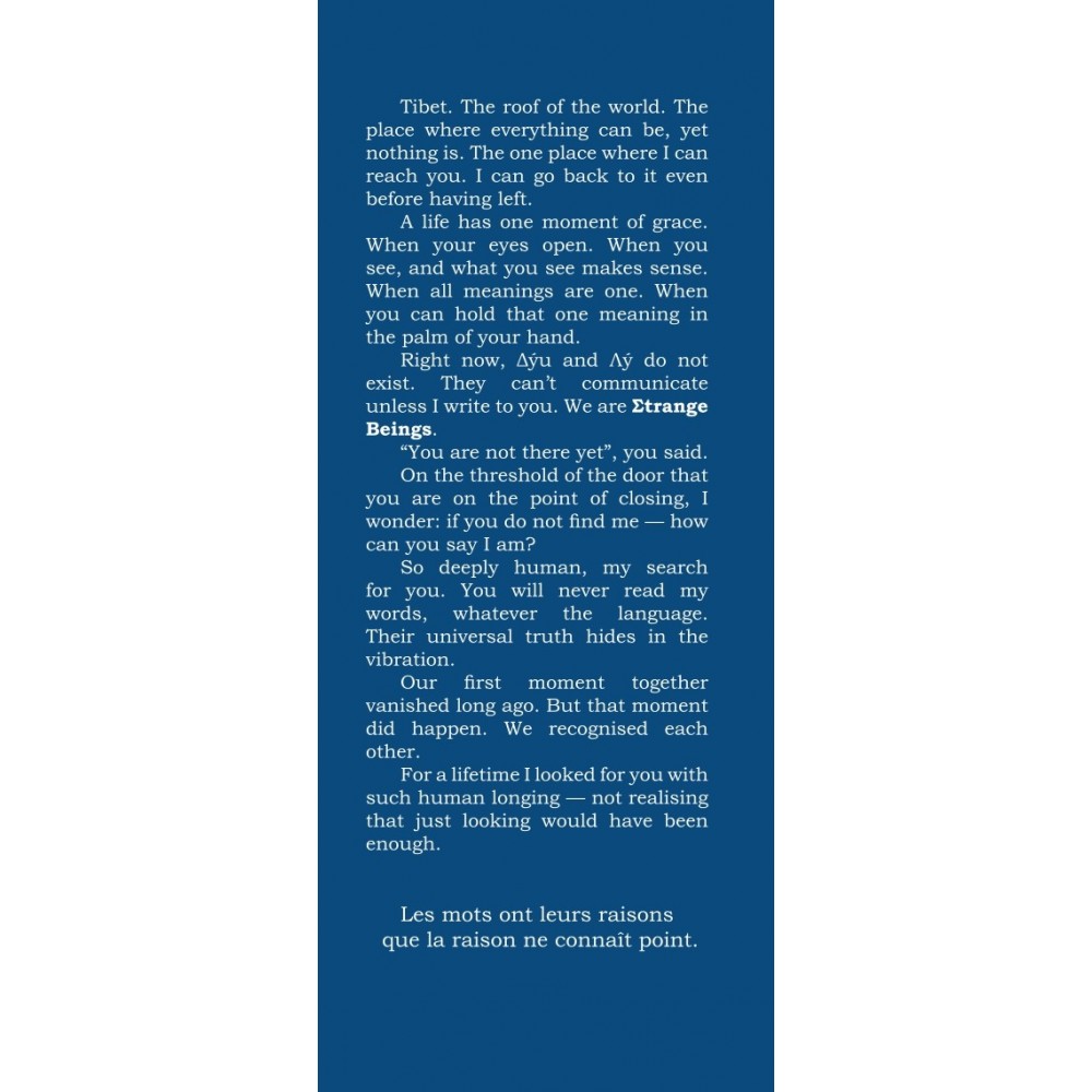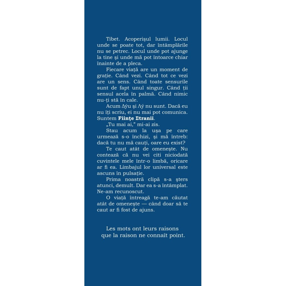 Tu ești o ființă stranie. Să te ții așa, una și bună, de la început pân’ la sfârșit, e de nemaivăzut. Dacă aș spune ce vrei tu să auzi – Nu se îndreaptă lucrurile. Sunt strâmbe. Am încercat din răsputeri să nu spun niciodată. Nu-mi place să spun. Sufletul îl dai pentru totdeauna. Așa ne recunoaștem.