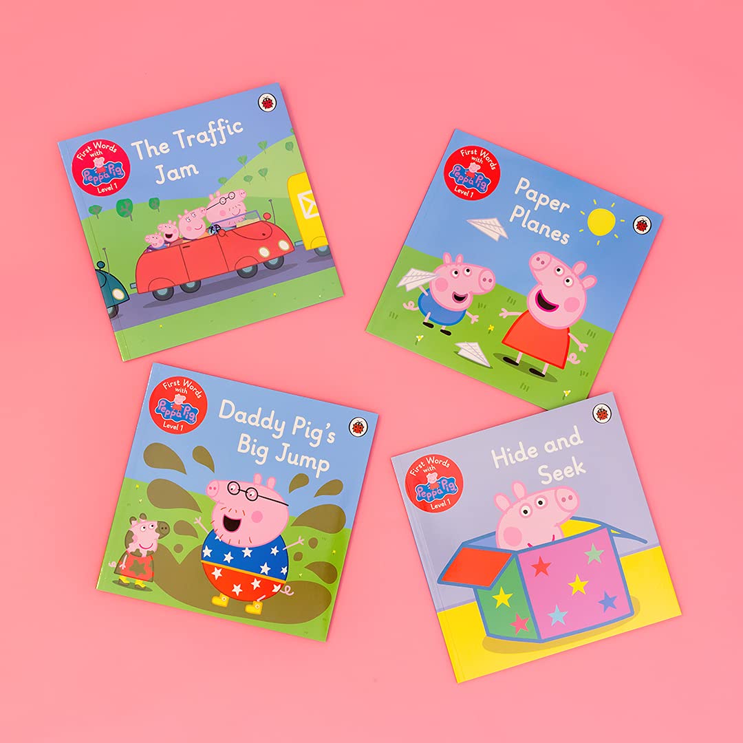 The four stories in First Words with Peppa Level 1 are: Daddy Pig's Big Jump, Hide and Seek, Paper Planes, and The Traffic Jam.