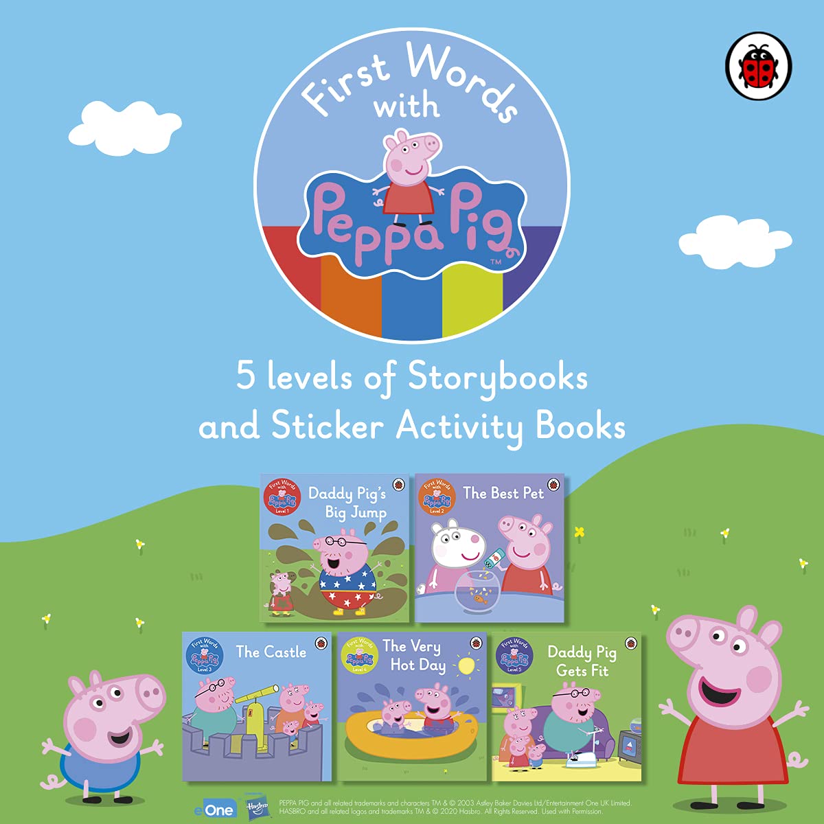The five levels of First Words with Peppa are suitable for children aged 4-6, or younger if supported by an adult. This Level 1 Box Set includes four Storybooks and four Sticker Activity Books.