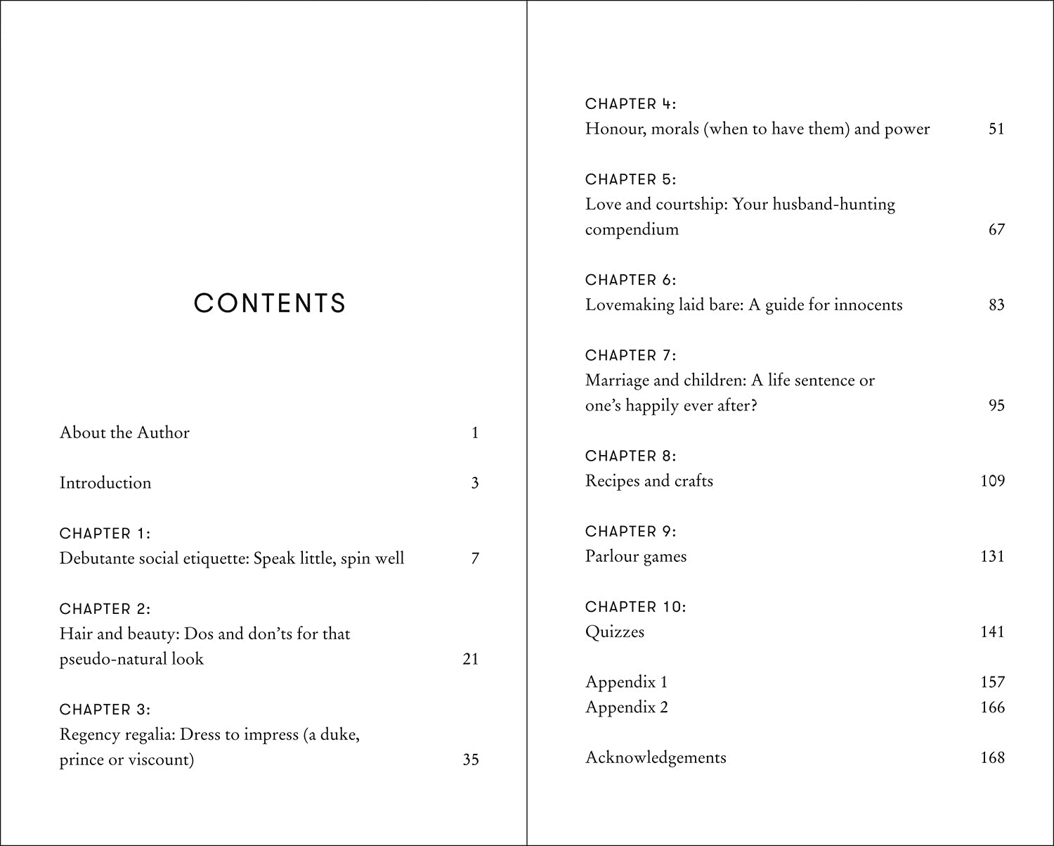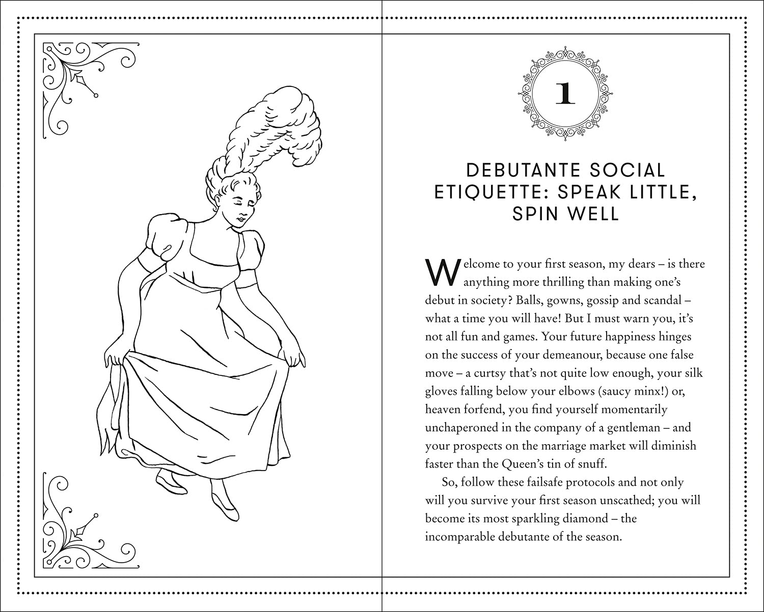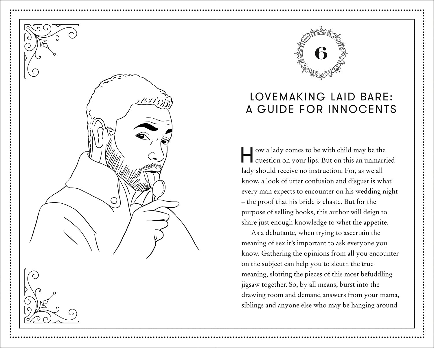 But panic not, dear ladies, for you shall find all the advice you so desperately need within these pages. Receive instruction on how to perfect the feigned swoon; the optimal height your breasts can be squashed to; just how many feathers in your headdress is too many; and why you should never enter a maze at night unaccompanied (unless you’re sure to be compromised by a sexy Duke and forced into marrying him).