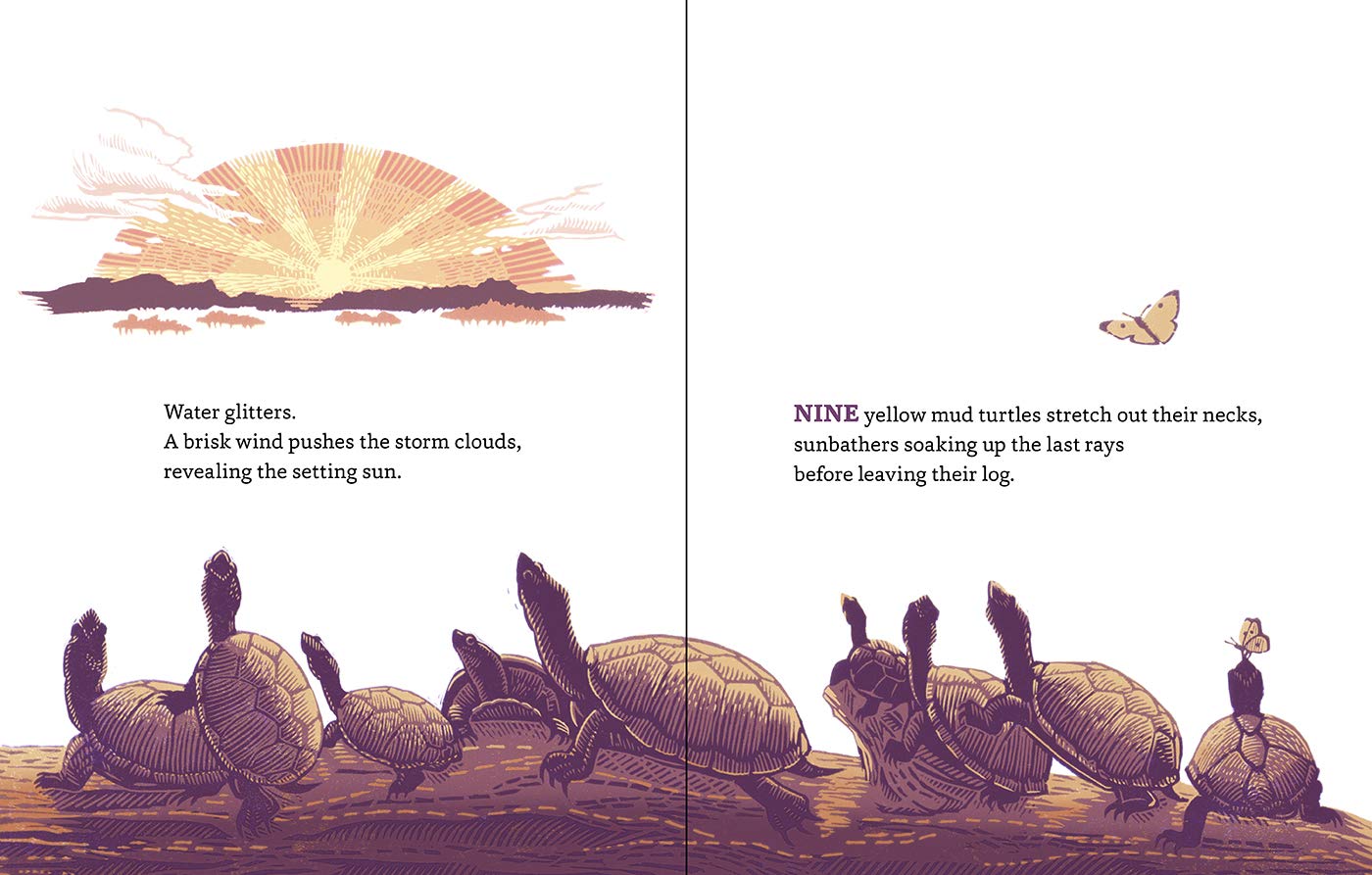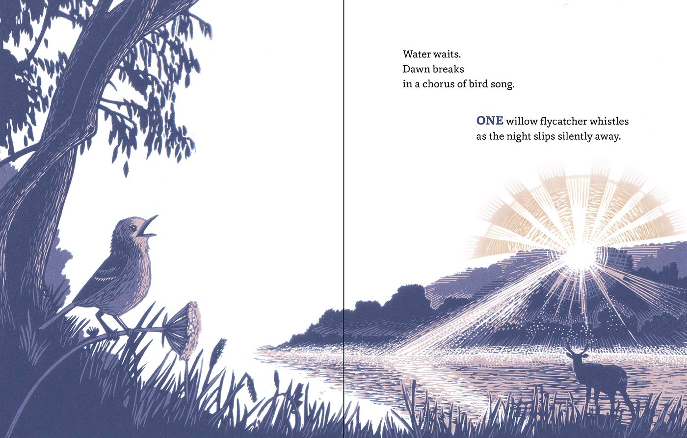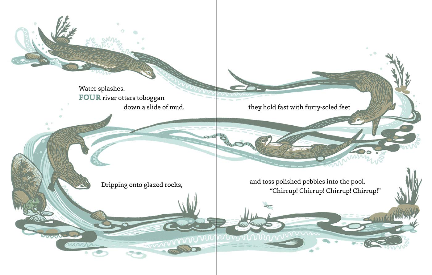 Water wakes. Wildlife greets the day and finds shelter, safety, and fun on the river in this lyrical, ecologically oriented counting book. One willow flycatcher, two dragonflies, three kit foxes, and more thrive in their habitat. As kids count, the day turns from dawn to dusk, and the character of the water changes as quickly as a child's moods. Animals sing, leap, tiptoe, toboggan, hoot, hunt, flit, flutter, and hover. They ride out a storm, bask in waning rays, and tuck in under the silver moon. Filled with modern wood engravings, Four Otters Toboggan celebrates wild beauty, encouraging readers of all ages to preserve and cherish our planet. After the story is finished, children can read more about each species in the back of the book, conservation efforts, what causes animals to become endangered, and what people can do to protect wild habitats.
