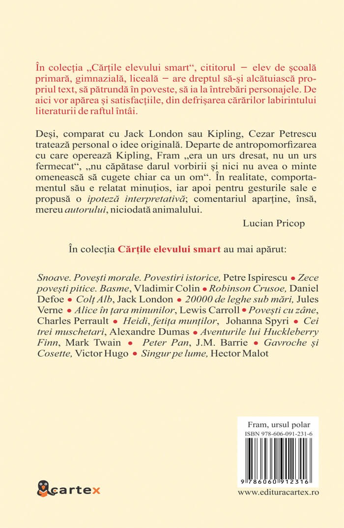 Desi comparat cu Jack London sau Kipling, Cezar Petrescu trateaza personal o idee originala. Departe de antropomorfizarea cu care opereaza Kipling, Fram „era un urs dresat, nu un urs fermecat“, „nu capatase darul vorbirii si nici nu avea o minte omeneasca sa cugete chiar ca un om“. In realitate, comportamentul sau e relatat minutios, iar apoi pentru gesturile sale e propusa o ipoteza interpretativa, comentariul apartine, insa, mereu autorului, niciodata animalului. - Lucian Pricop