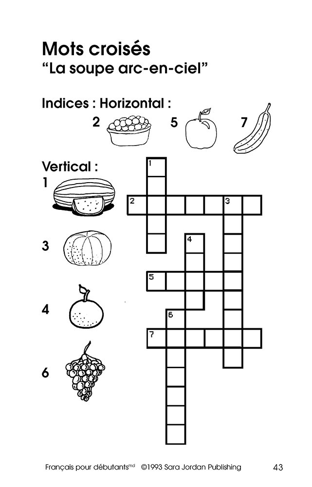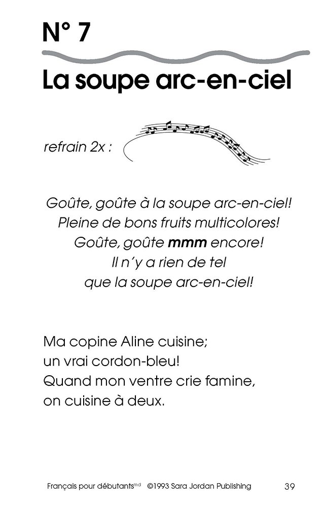 Great for beginners. Songs that teach the alphabet, farm animals, counting, family members, parts of the body, days of the week, colors, fruit, opposites and shapes in French. Packaged with an activity/lyrics book.