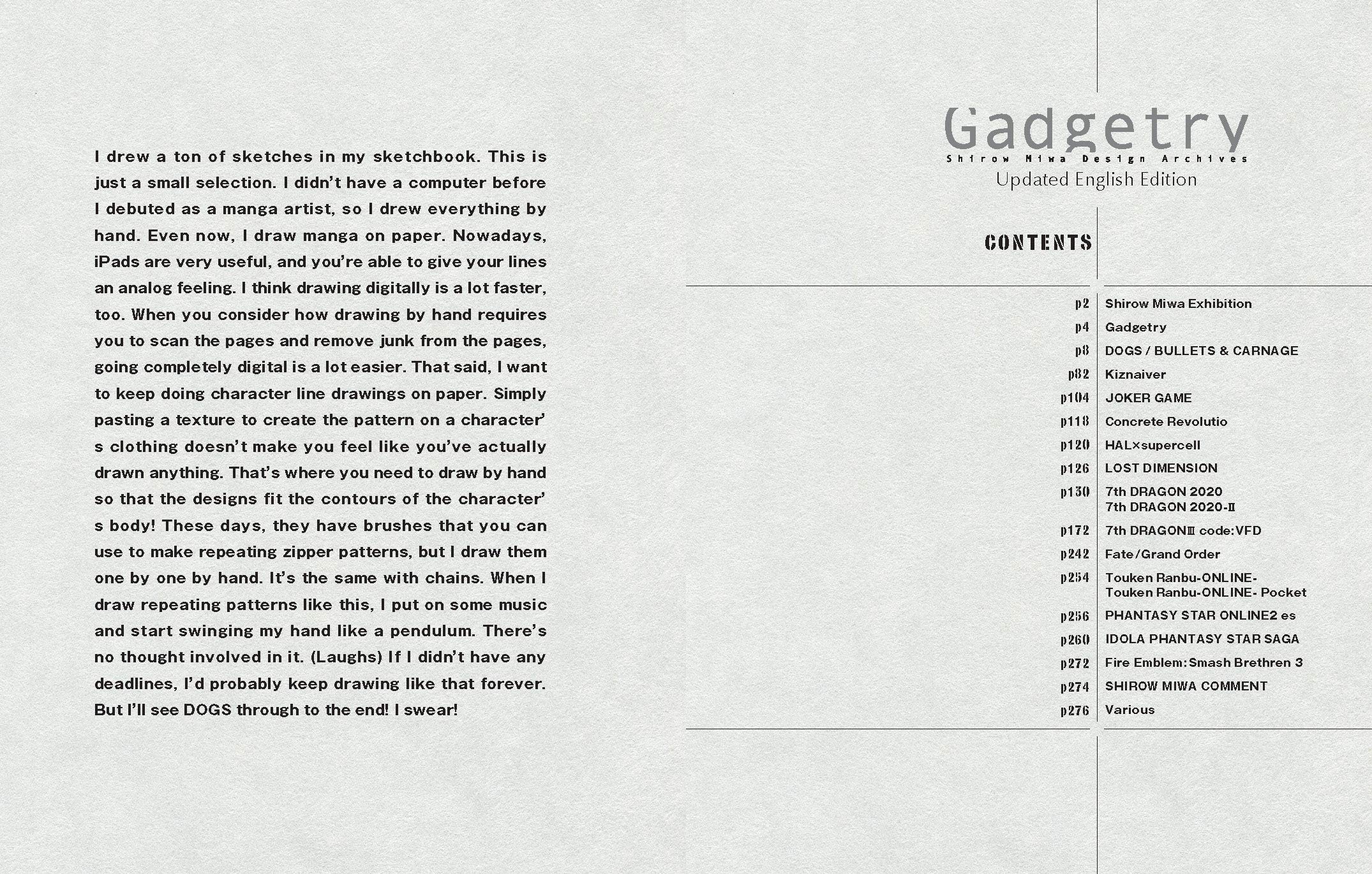 Shirow Miwa, the Japanese manga artist and illustrator, is best known for the manga series DOGS and RWBY, but has also contributed to visual works such as the 7th Dragon 2020 and Fate / Grand Order games, and the animated films Kiznaiver and JOKER GAME. In his career as a manga artist and an illustrator, Miwa has drawn a range of edgy characters from ancient people with animal ears, summoned beasts and superhero-like aliens, to true bad boys wearing glasses, pretty girls riding robots, a mysterious priest, samurai in sailor uniforms, brutal twins, a macho butler, a hot boss and many more...