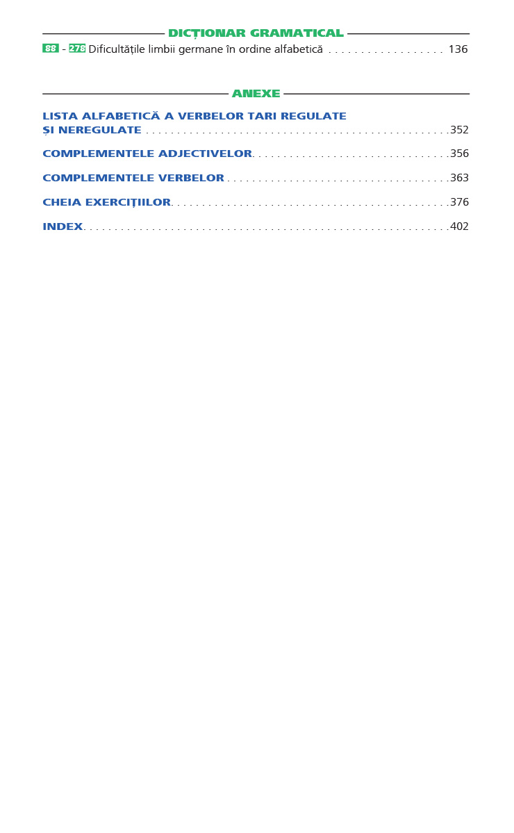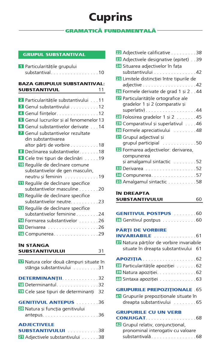 Conform principiilor după care este editată această colecţie, prezenta gramatică are două părţi complementare. Prima conţine noţiuni gramaticale de bază, fiind constituită din trei subpărţi: grupul substantival, grupul verbal şi fraza. A doua parte este un dicţionar gramatical cu cei mai importanţi termeni. Consultarea simultană a celor două părţi ale lucrării este facilitată de către un index situat la sfârşitul volumului.