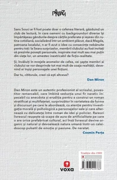 Sans Souci ar fi fost poate doar o cafenea literară, găzduind un club de lectură, în care oameni cu backgrounduri diverse își împărtășeau gândurile despre cărțile preferate și ieșeau din rutina cotidiană, socializând într-un ambient plăcut, dacă Magda, patroana localului, n-ar fi avut o idee cu consecințe nebănuite pentru toți: la Seara surprizelor, membrii clubului au fost invitați să prezinte povești personale, inspirate mai mult sau mai puțin din viața lor, un amestec inextricabil de ficțio-realitate. Și, învăluiți în mrejele aromelor de cafea, cei șapte membri ai clubului se vor desprinde tot mai mult de coaja realității, devenind ei înșiși personajele unei ficțiuni. Dar tu, cititorule, crezi că ești altceva? - Dan Miron