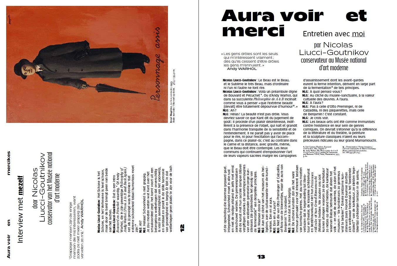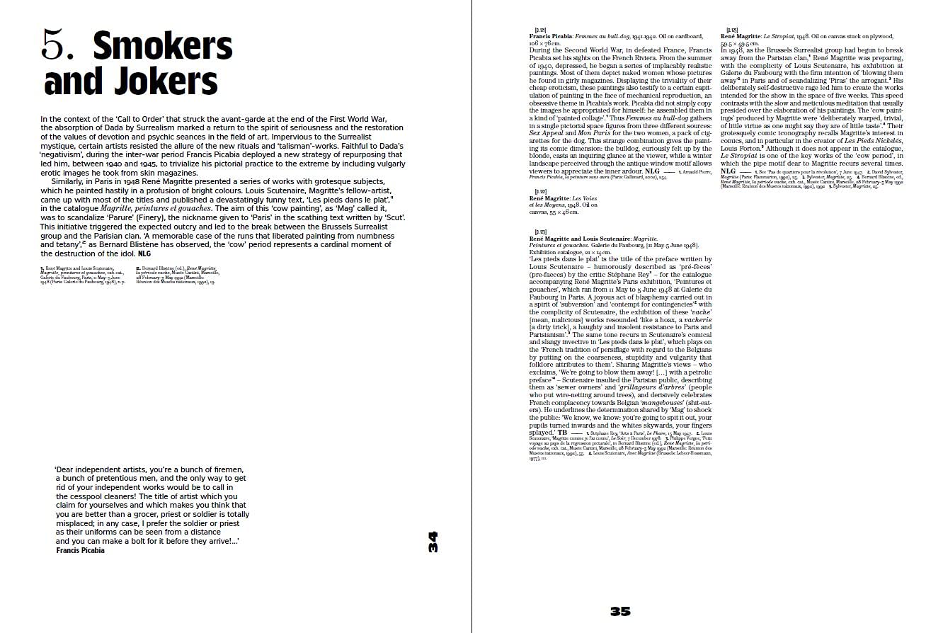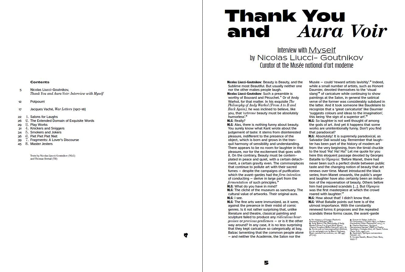 A humorous essay by curator Nicolas Liucci- Gutnikov introduces the subject. An anthology of philosophical and historical texts puts humour as a tool of criticism in context, from Pascal, Montaigne, to Baudelaire and Nietzsche... Finally, some humorous quotes Dada and surrealist artists and writers punctuate the book.