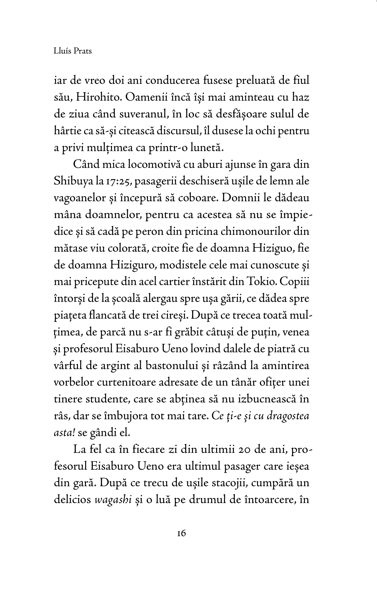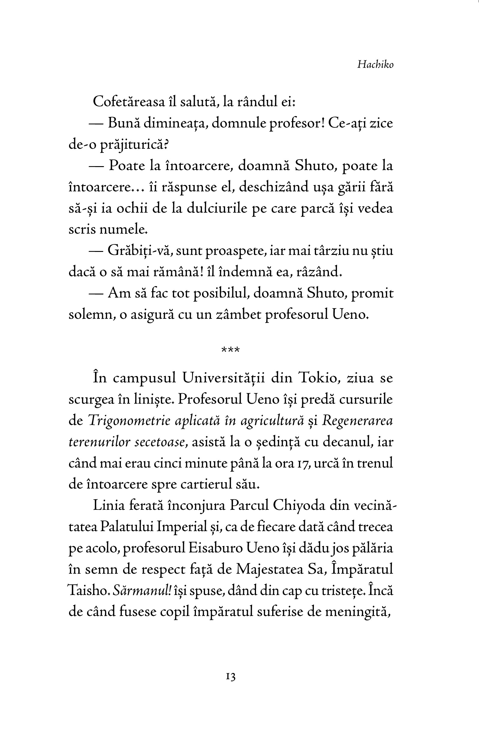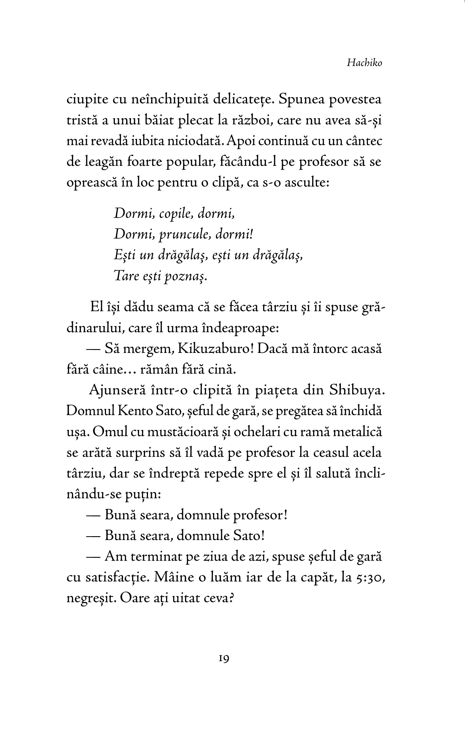 În fiecare dimineață Hachiko își însoțește stăpânul la gara și în fiecare după-amiaza îi a_teapta întoarcerea, la 17:30 _ x. Zi de zi, săptamână după săptămână, lună de lună, an dupa an...